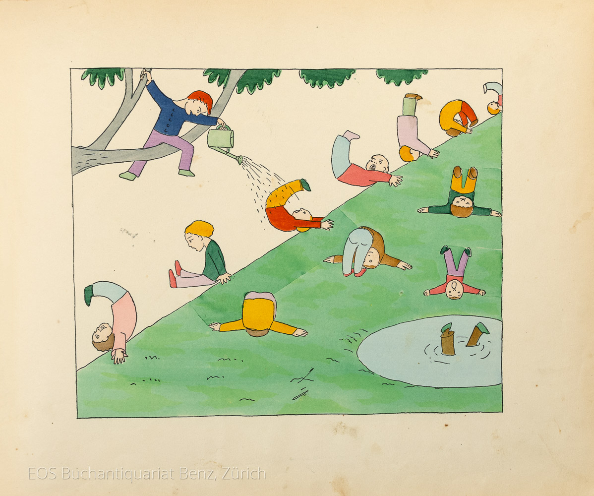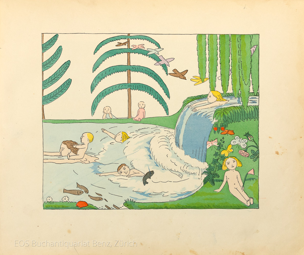 Doderer I, 413. – Ries 530. – Schug 516. – Bilderwelt 516. – Stuck Villa II, 185. – Pressler S. 208. – Vgl. Cotsen 3548 (für Ausgabe um 1908). – Zweite Auflage.dea zweiten Buches in dieser Reihe. – Freyhold (1878-1944) unternahm nach seinem Studium an der Karlsruher Akadamie Reisen nach London, Fiesole und Paris. Geprägt vom franz. Impressionismus wirkte er erstmals bei der Illustration von Dehmels Sammelband «Buntscheck» (Köln 1904) mit. Darauf publizierte er selbständig seine Bilderbücher, womit er sofort grosse Aufmerksamkeit erlangte. Seine Kinderbücher sind vom Einband über die Vorsätze bis zum Inhalt als Einheit, detailreich mit zarten Pastellfarben durchgestaltet. «Hier macht sich der Einfluss der Kunsterziehungsbewegung auf Freyhold geltend. In einer Vorliebe für pflanzenhafte Motive und für die Ornamentik finden sich Elemente des Jugendstils» (Doderer). – Durchgehend fingerfleckig, Gebrauchsspuren, Einband berieben und fleckig. (Sprache: Deutsch / German)