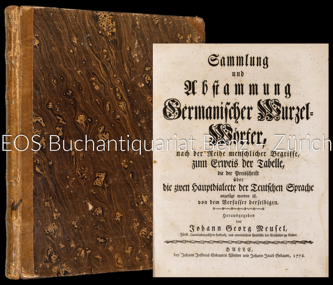 Fulda, Friedrich Carl:  Sammlung und Abstammung germanischer Wurzelwörter, nach der Reihe menschlicher Begriffe, zum Erweis der Tabelle, die der Preisschrift über die zwey Hauptdialecte der Teutschen Sprache angefügt worden ist, von dem Verfasser derselbigen (i. e. Friedrich Carl Fulda). Halle, Gebauer, 1776. 4°. (6) Bl., 436 S., (2) Bl. (Verbesserungen). Mit einer gefalteten Tabelle. Halblederband der Zeit.