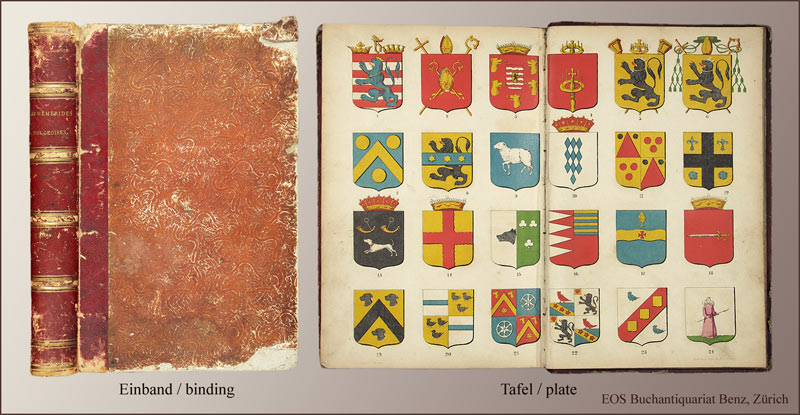 Gailliard, J.: Éphémérides Brugeoises où relation chronologique des événements qui se sont passés dans la ville de Bruges, depuis les temps les plus reculés jusqu’à nos jours. Ouvrage orné de 168 blasons coloriés avec le plus grand soin. Bruges, J. Gailliard, 1847. Gr.-8°. (4), 474, V S. Mit 168 kolor. Wappen auf 7 doppelblattgr. Tafeln. Halblederband der Zeit (stark berieben und bestossen, Gelenke oben mit kleinen Fehlstellen).