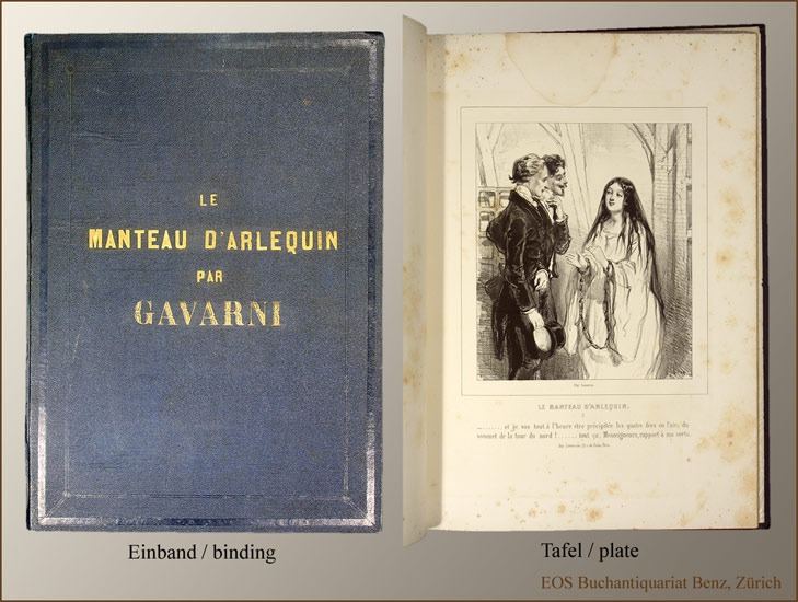Gavarni, Paul (eig. Sulpice Guillaume Chevalier): Le manteau d’Arlequin. (Paris, Imp. Lemercier, 1852). Gr.-4°. 12 lithographierte Tafeln nach Gavarni. Leinenband der Zeit mit goldgepr. Deckeltitel (fleckig, berieben und bestossen).