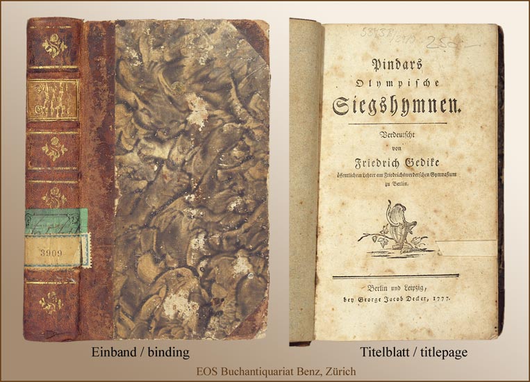 Vgl. W/G I (Autoren), 1276: „Die Epinikien, für Sieger in den Wettkämpfen der genzen griech. Welt von Chören vorgetragen, enthalten 3 Elemente: Angaben über den Sieger (…) dann e. Mythos, der die Normen u. Werte gibt (…) schliesslich die Gnomik, in der sich die höchste Bewusstseinsstufe des archaischen Dichters ausspricht“. Beide Bände übersetzt u. Band 2 mit Anmerkungen u. Erklärungen versehen von Friedrich Gedike. – Mit 2 mont. alten Bibliotheksschildern auf fest. Vorsatz. Leeres erstes Blatt mit Ecksbschnitt u. Titelseite mit kl. Fehlstelle (ohne Textverlust). Durchgehend gebräunt u. stockfleckig. Aus der Freude’schen Bibliothek. Carl Gabriel August Freude (1800 – 1879) war ein Fabrikant, der seine Bibliothke der Gemeinde Ebersbach stiftete.