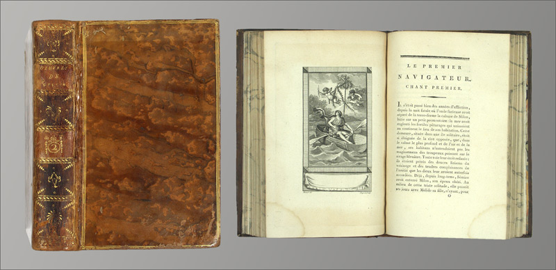 Gessner, (Salomon): Oeuvres. Paris, Dufart, o.J. (1795). 2 Bände. 8°. (2) Bl., 367 S.; 1 Bl., 447 (1) S. Mit gest. Titel von Marillier, 1 Porträt von Delvaux und 24 Kupfertafeln von Monnet. Lederbände der Zeit.