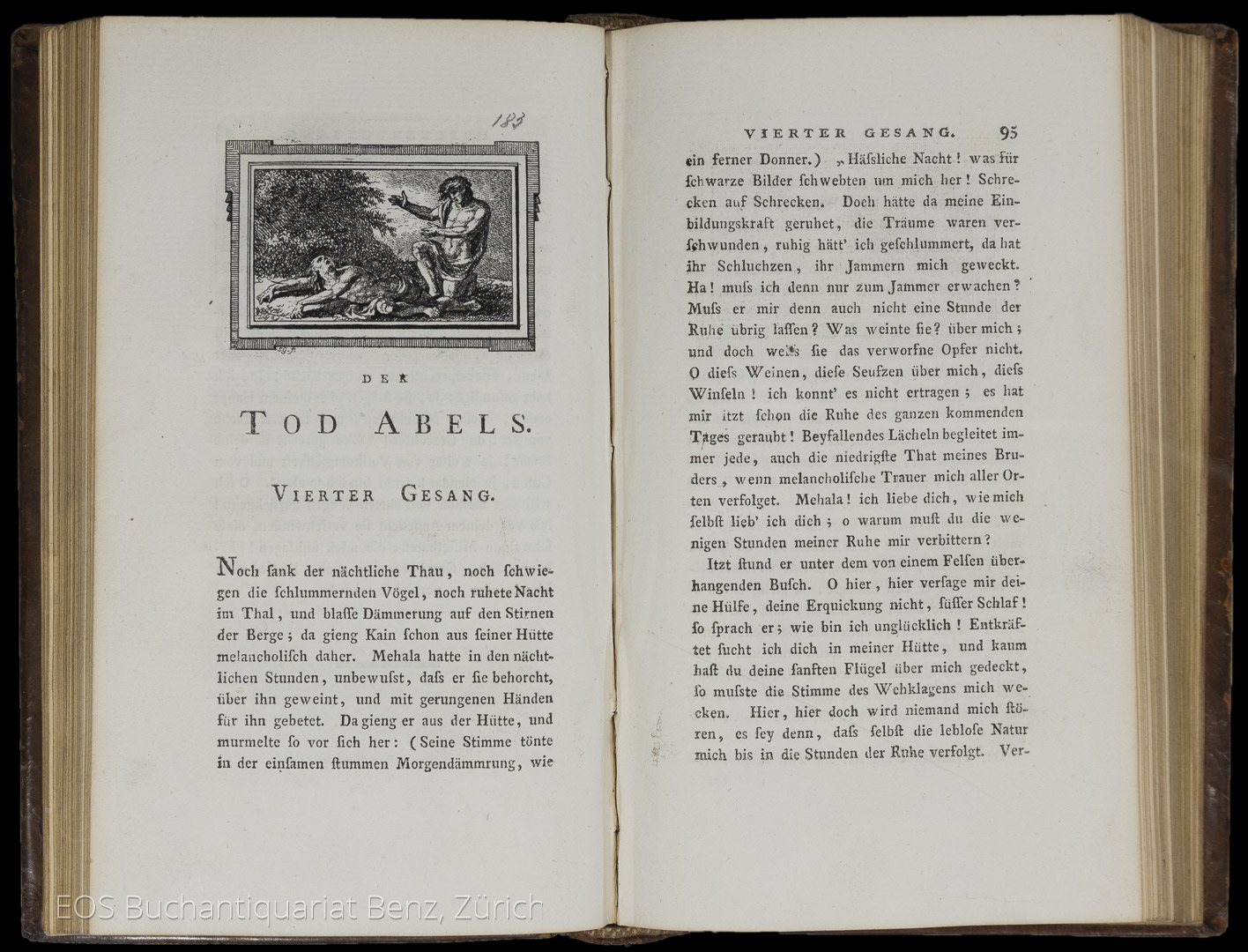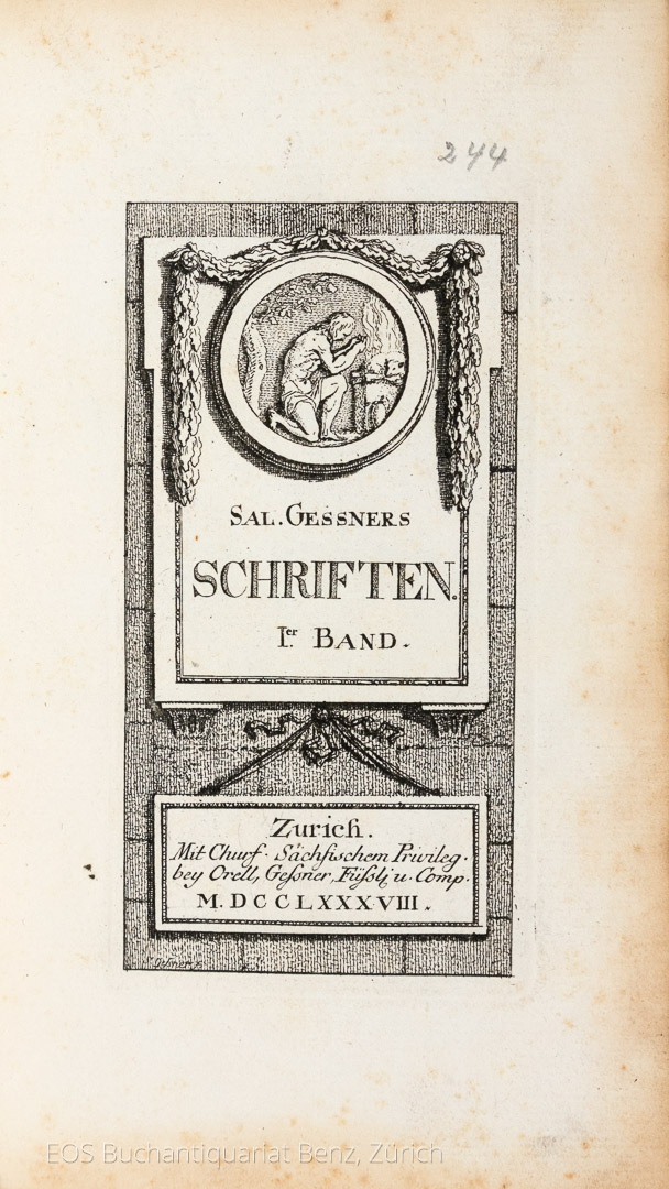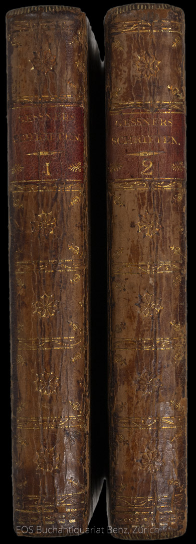 Gessner, Salomon: Schriften. Zürich, Orell, Gessner, Füssli u. Comp., 1788. 2 Bände. 8°. 307 S.; 304 S. Mit 33 Radierungen von Salomon Gessner. Lederbände der Zeit mit verblasster Rückenvergoldung.
