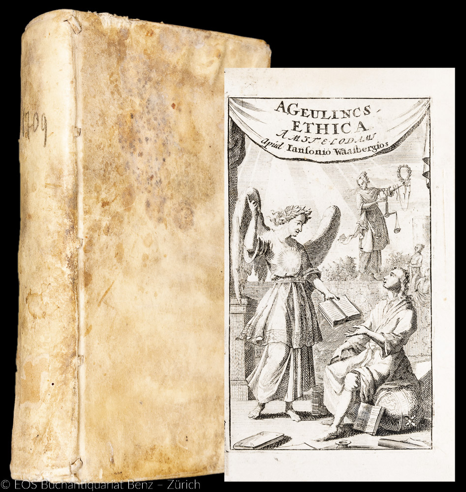 Geulincx, Arnold: Arnoldi Geulincs … Gnothi Seauton, Sive Ethica, Post tristia Auctoris fata Omnibus suis partibus in lucem edita … Cui accessit … Cornelii Bontekoe … Passionibus Animæ. Amstelodami, Janssonio-Waesbergius, 1709. Editio Ultima, ab Eodem a mendis amplius centum accuratissime emendata. (15) Bl., 433 (von 437) S. Mit gest. Titel. Pergamentband der Zeit.