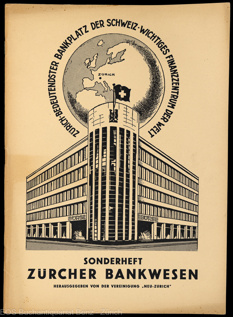 Greuter, A. (Redaktor): Das Zürcher Bankwesen. Sonderheft: Zürich – Bedeutendster Bankplatz der Schweiz – Wichtiges Finanzzentrum der Welt. Zürich, Vereinigung „Neu-Zürich“, 1983. 4°. 56 S. Mit vielen Abbildungen der Gschäftslokalitäten. Illustriert Orig.-Broschur.