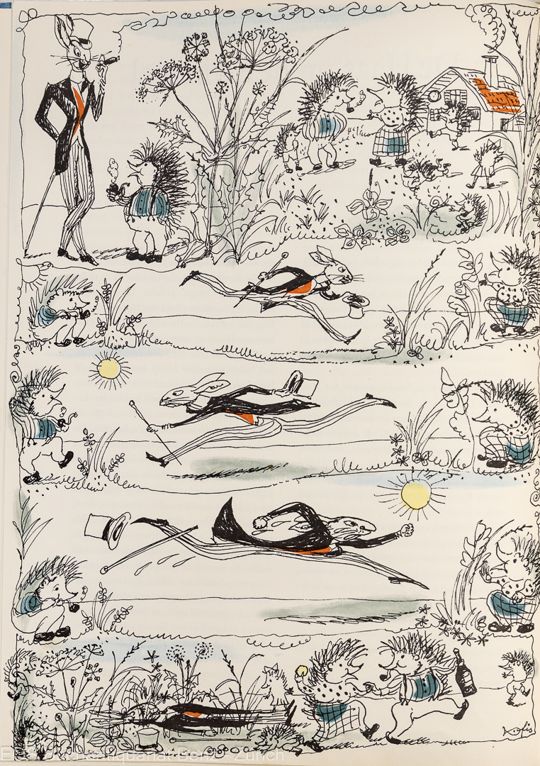 Fischer. – Grimm, Brüder: Märchenbilder. Sieben Märchen der Brüder Grimm. Zürich u. Stuttgart, Artemis, 1961. Gross-4°. 34 (2) S. Mit 7 farb. ganzs. Illustr. von Hans Fischer. Illustr. Orig.-Halbleinenband.