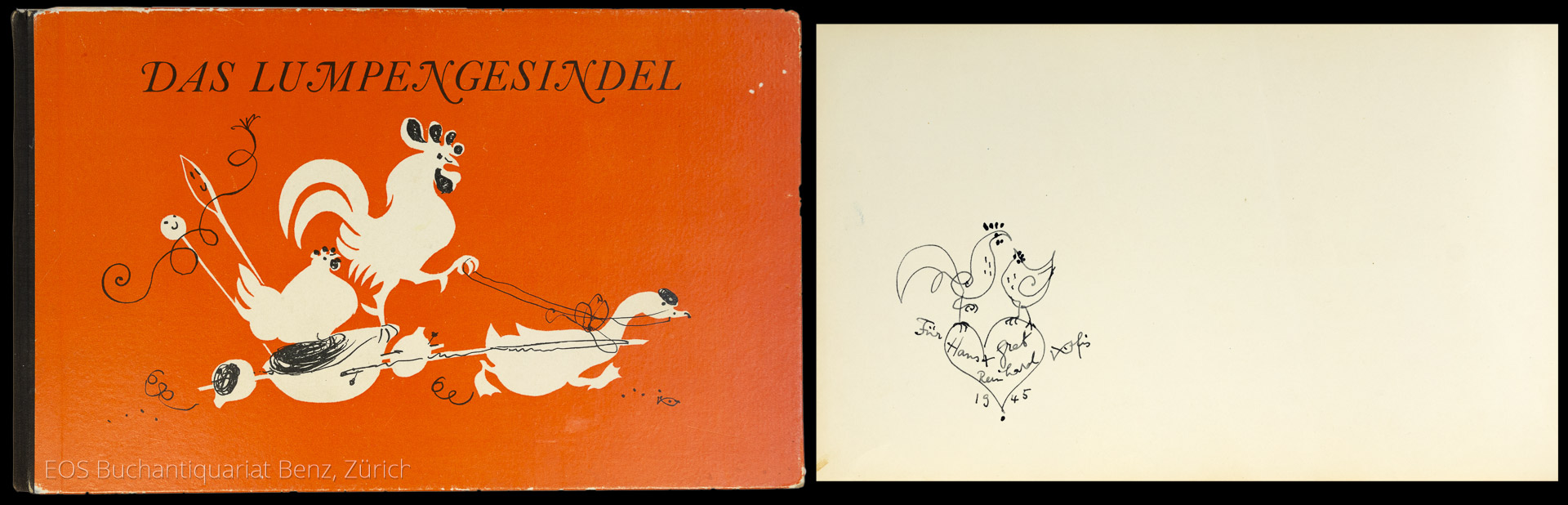 Lexikon der Schweizer Bilderbuchillustratoren S. 197, Nr. 636. – Erste Ausgabe, erschien gleichzeitig im Verlag der Wolfsbergdrucke. Mit einer Originalzeichnung von Hans Fischer, gewidmet «für Hans + Gret Reinhard, 1945», signiert. – Mit einem Exlibris von H. + G. Reinhard auf dem Vorsatz. (Sprache: Deutsch / German)