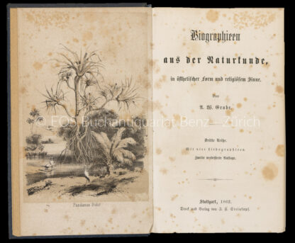 Grube, August Wilhelm: Biographieen aus der Naturkunde, in ästhetischer Form und religiösem Sinne. Stuttgart, Steinkopf, 1869. Sechste verbesserte Auflage, 4 Teile in 2 Bänden. 364 S., 268 S.; 267 S., 331 S. Mit 1 lithogr. Frontisp., 4 lithogr. Tafeln und 4 Textillustr. Moderne Kunstlederbände.