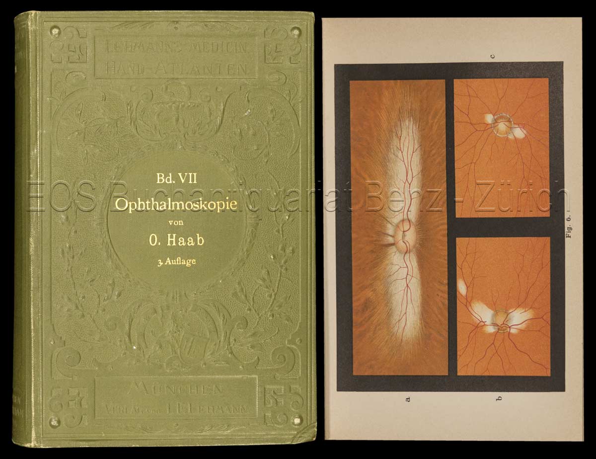 Haab, O(tto): Atlas und Grundriss der Ophtalmoscopie und ophtalmoscopischen Diagnostik. München, Lehmann, 1900. Dritte stark vermehrte Auflage. 8°. IX S, 82, 82 S., 19 S. (Verlagsanz.). Mit 87 meist farb. Tafeln und einigen Textillustr. Grüner Orig.-Leinenband.
