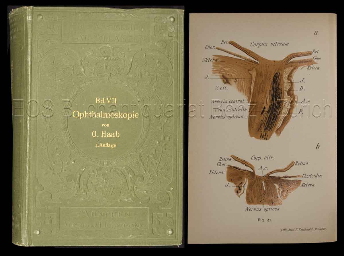 Haab, O(tto):  Atlas und Grundriss der Ophtalmoscopie und ophtalmoscopischen Diagnostik. München, Lehmann, 1904. Vierte verbesserte Auflage. 8°. XI, 82, 90 S. Mit 87 meist farb. Tafeln und einigen Textillustr. Grüner Orig.-Leinenband.