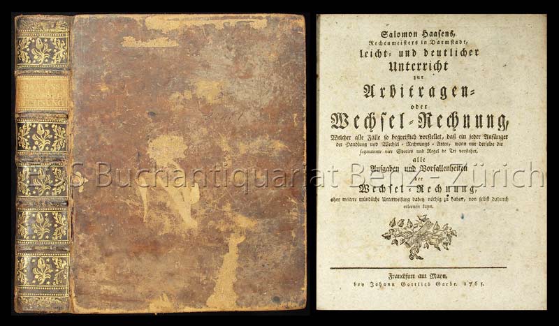 Haas, Salomon: Leicht- und deutlicher Unterricht zur Arbitragen- oder Wechsel-Rechnung, welcher alle Fälle so begreiflich vorstellet, dass ein jeder Anfänger der Handlung und Wechsel-Rechnungs-Arten wann nur derselbe die sogenannte vier Species und Regel de Tri verstehet, alle Aufgaben und Vorfallenheiten der Wechsel-Rechnung … selbst dadurch erlernen kann. Frankfurt am Main, Johann Gottlieb Garbe, 1765. 4°. (4) Bl., 623 (1) S. Mit Holzschnitt-Buchschmuck. Kalbleder d. Zt. mit Rückenschild und reicher Rückenvergoldung.