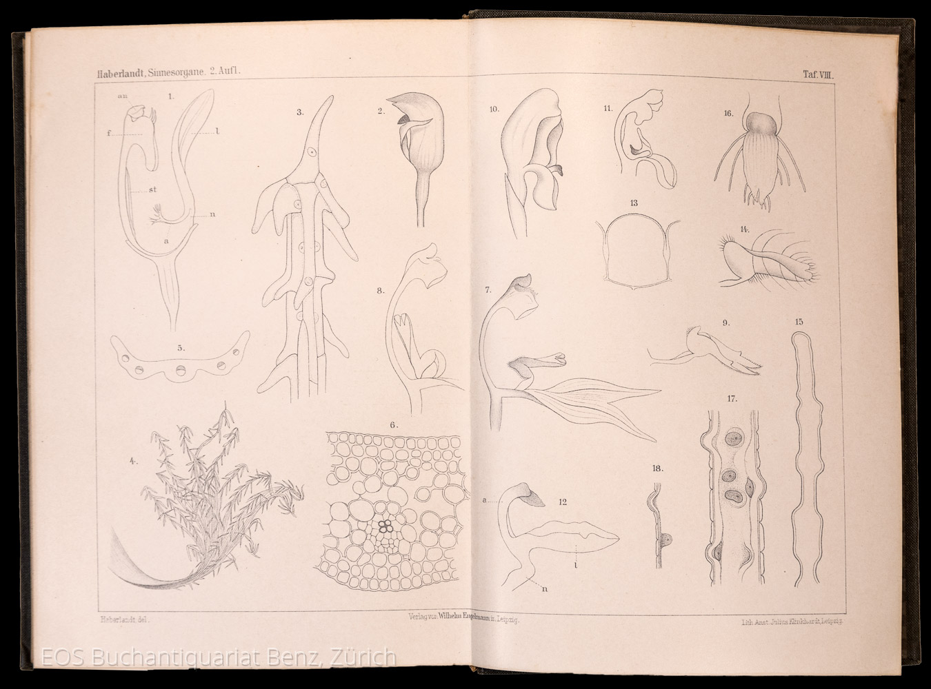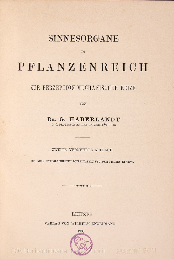 Haberlandt, G(ottlieb): Sinnesorgane im Pflanzenreich zur Perzeption mechanischer Reize. Leipzig, Wilhelm Engelmann, 1906. 8°. VIII, 207 S. Mit 9 doppelblattgrossen Tafeln. Orig.-Leinenband.