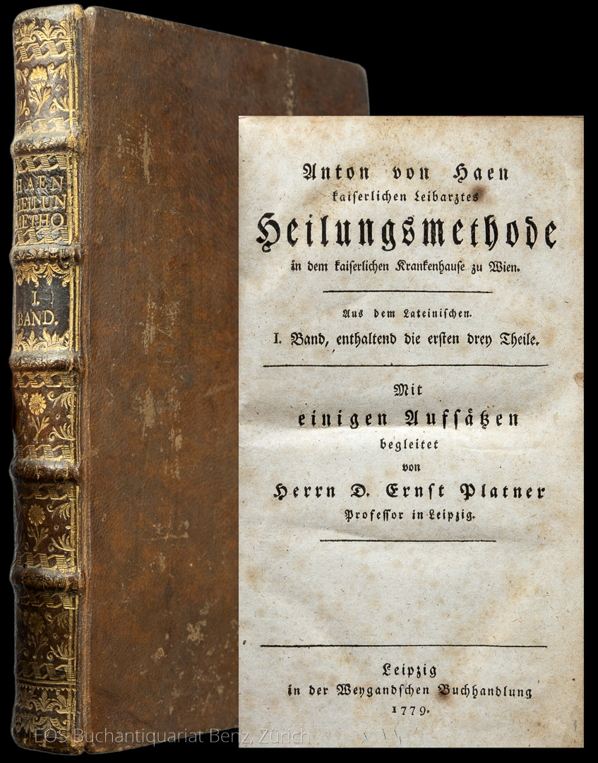Haën, Anton de: Heilungsmethode in dem Kaiserlichen Krankenhause zu Wien. Aus dem Lateinischen. I. Band, enthaltend die ersten drey Theile. Mit einigen Aufsätzen begleitet von Ernst Platner. Leipzig, Weygandsche Buchhandlung, 1779. 1. Band. 8°. (6) Bl., 426 S. Lederband der Zeit mit reicher Rückenvergoldung