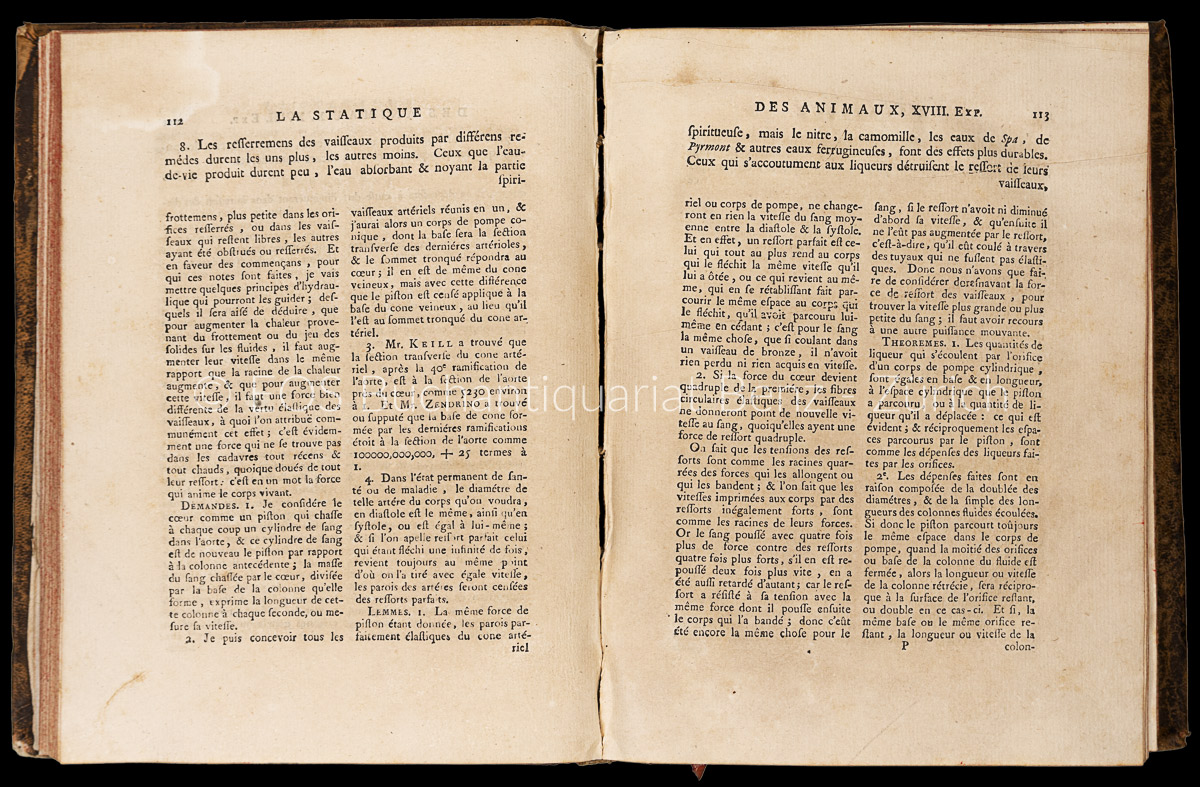 Hales, Stephen: Haemastatique, ou la statique des animaux: expericens hydrauliques faites sur des animaux vivans. Avec un recueil de quelques experices sur les pierres que l’on trouve dans les reins & dans la vessie; & des recherches sur la nature de ces concrétions irrégulières. Ouvrage tres utiles aux medecins. Traduit de l’Anglois, & augmenté de plusieurs remarques & de deux dissertations de medecine, sur la théorie de l’inflammation, et sur la cause de la fièvre; par (François Boissier) Sauvage (de Lacroix). Genève, Cramer, 1744. 4°. XXII S., 348 S. Mit gefalteter Holzschnitt-Tafel. Lederband aus der Zeit mit rotem, goldgeprägtem Rückenschild und floraler Rückenvergoldung.