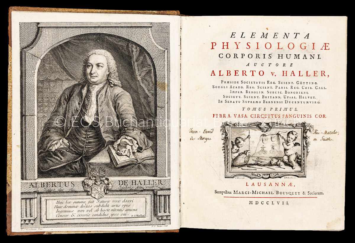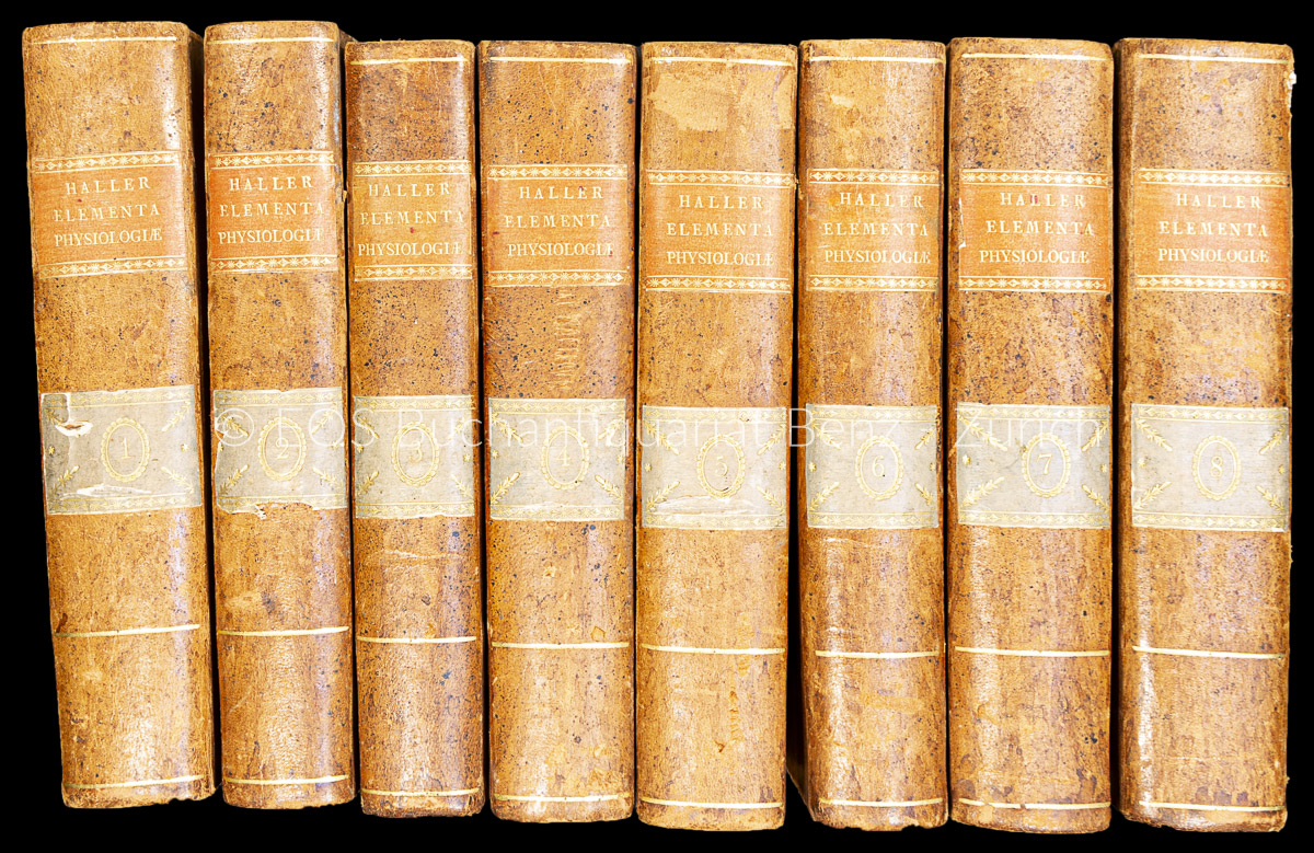 Garrison & Morton 588. – Waller 4007. – Wellcome III, 199. – Blake 195. – HOH 886. – Bibliographia Halleriana S. 84. – Mischauflage. Die Bände 1–3 in Erstausgabe, die restlichen Bände in zweiter Ausgabe. – «Die achtbändige ‹Elementa physiologieae› stellen Hallers umfassende Synthese des gesamten Wissens der Zeit dar, beurteilt auf Grund der eigenen Forschungen und Ansichten dar und sind sein wissenschaftliches Hauptwerk» (Halleriana). «There are many physiological discoveries in this book that were forgotten, only to be rediscovered again years later. Two notable examples are the myogenic theory of the heart beat and the role of bile in the digestion of fat» (HOH). – Papier wenig gebräunt und stockfleckig. Einbände berieben und bestossen. Band 8 mit Lederfehlstelle am Gelenk. (Sprache: Lateinisch / Latin)