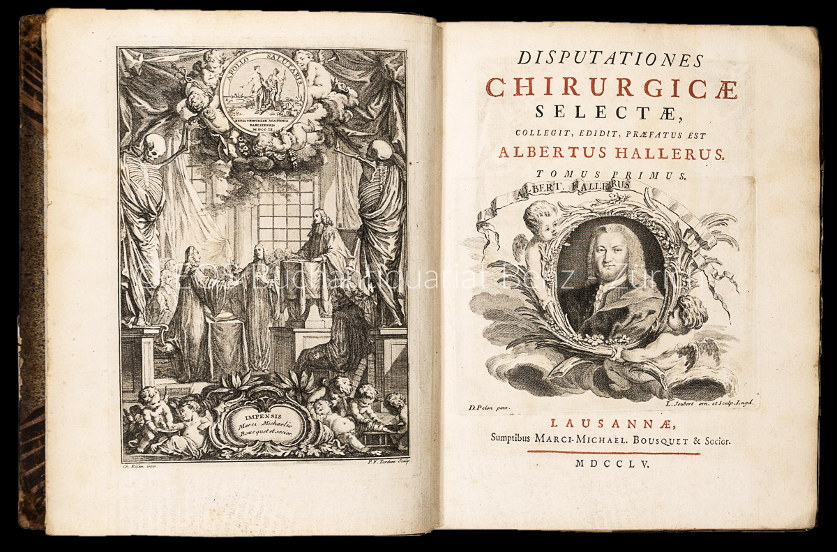 Haller, Albrecht von (Hrsg.): Disputationes Chirurgicae selectae, collegit, editit, praefatus est Albertus Hallerus. Lausanne, Marc-Michele, 1755–1756. 5 Bände. 4°. Mit gestochenem Frontisp., 5 wiederholten Porträt-Titelvignetten und 51 Kupfern auf 50 Tafeln (davon 22 gefaltete). Halblederbände aus der Zeit.