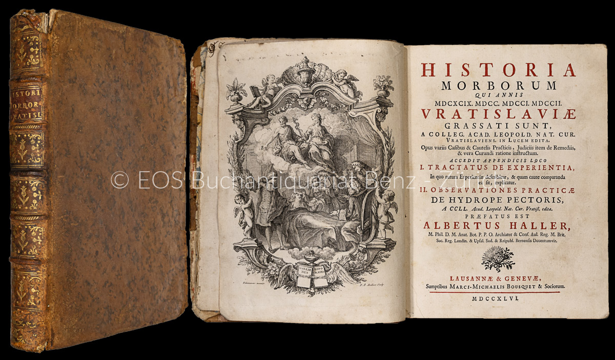 Haller, Albrecht von (Vorwort): Historia morborum qui annis (1699–1702) Vratislaviae grassati sunt. A Colleg. Acad. Leopold. Nat. Cur. Vratislaviens. in lucem edita. Opus variis casibus & cautelis practicis, judiciis item de remediis, & vera curandi ratione instructum. Accedit appendicis loco I. Tractatus de experientia, in quo natura experientiae describitur, & quam caute comparanda ea sit, explicatur. II. Observationes practicae de hydrope pectoris. Lausanne & Genève, M.M. Bousquet, 1746. 4°. X S., 480 S. Mit gestochenem allegorischem Frontispiz und einigen hübschen Holzschnitt-Initialen und Vignetten. Lederband aus der Zeit mit rotem, goldgeprägtem Rückentitel und floraler Rückenvergoldung.