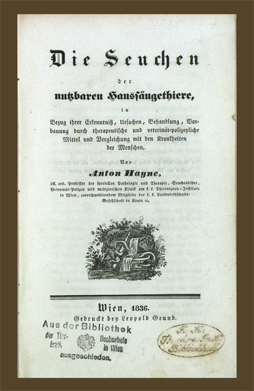 Hayne, Anton: Die Seuchen der nutzbaren Haussäugethiere, in Bezug ihrer Erkenntniss, Ursachen, Behandlung, Vorbauung durch therapeutische und veterinär-polizeyliche Mittel und Vergleichung mit den Krankheiten der Menschen. Wien, Leopold Grund, 1836. Gr.-8°. VI S., 1 n.n. Bl., 504 S., 3 n.n. S. Druckfehler. Mit 2 gefalteten Tabellen. Pappband der Zeit mit goldgeprägtem Rückenschild.