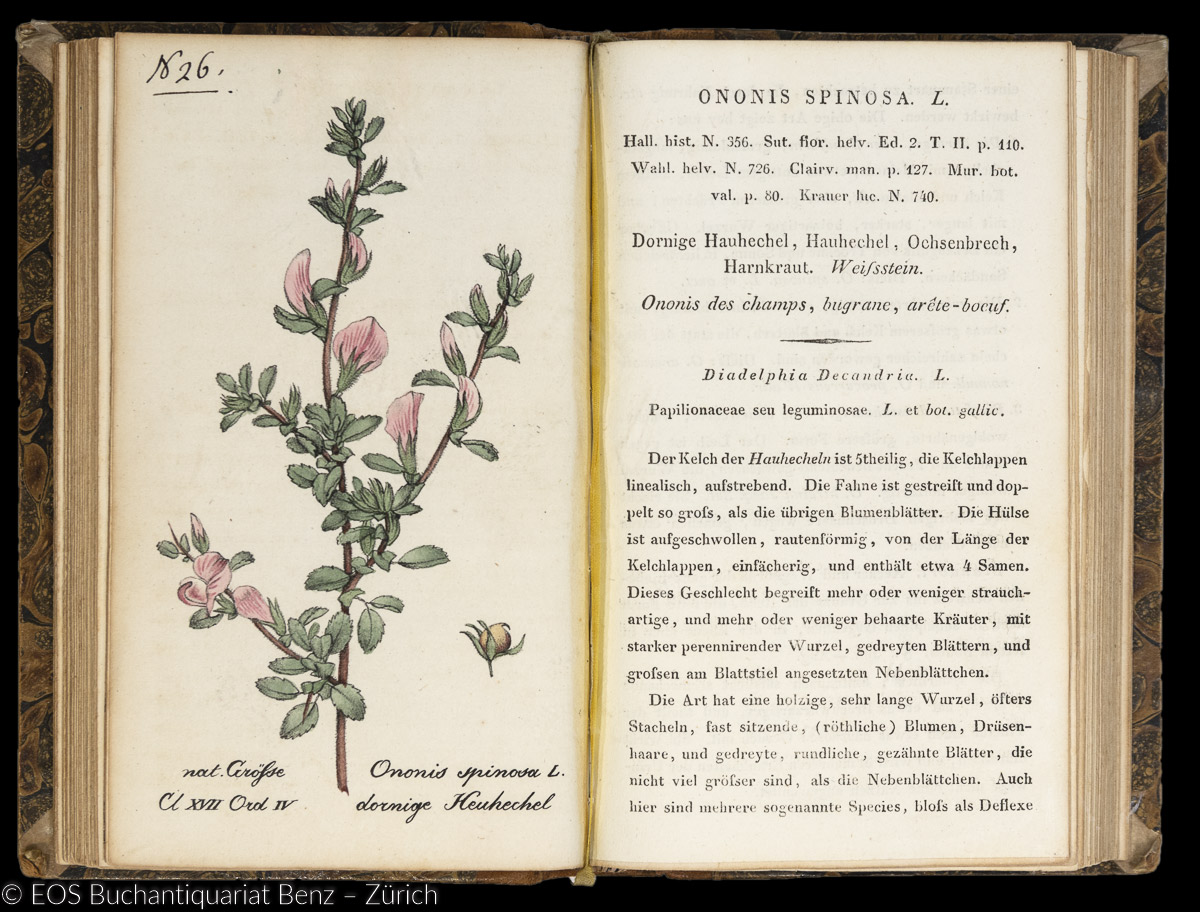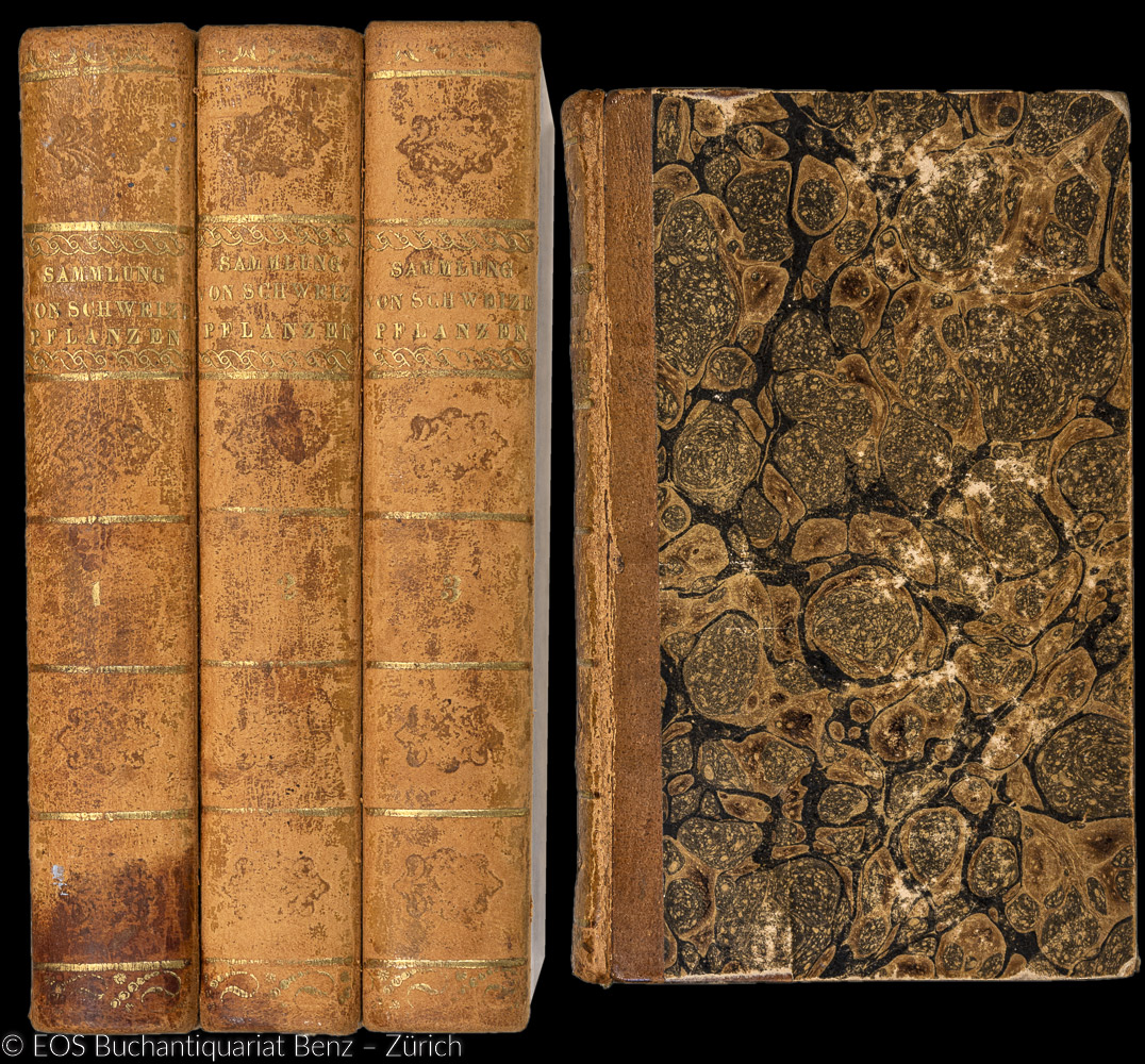Nissen 838. – Senn: Die Entstehung von J .D Labram’s «Sammlung von Schweizerpflanzen». – Geiger, Hermann: J. D. Labram, der Basler Kleinkünstler, und sein Werk (in Stultifera navis S. 28–33). – Erste Ausgabe der ersten Serie in dekorativen zeitgenössischen Einbänden. Die Textseiten neben den Tafeln mit eingebunden. Neben «Beyträge zu einer kritischen Aufzählung der Schweizer Pflanzen (1831)» Johannes Hegetscheilers (1789–1838) Hauptwerk. Die erste durchgängig illustrierte Schweizer Flora, die in 15 Jahren in Lieferungen erschien. Die Lithographien vom Basler Künstler Jonas David Labram (1785–1852), der die Tafeln zusammen mit seiner Tochter Louise sorgfältig kolorierte. – Einbände etwas berieben und bestossen. (Sprache: Deutsch / German)