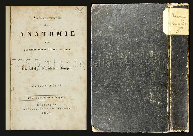 Hempel, Adolph Friedrich: Anfangsgründe der Anatomie des menschlichen Körpers. Göttingen, Vandenhoeck und Ruprecht, 1827. Fünfte verbesserte Ausgabe. 2 Bände. 8°. XII, 483 S; XII, 546 (recte 544) S. Pappbände der Zeit mit handschr. Rückensch. und Kleisterpapierbezug.