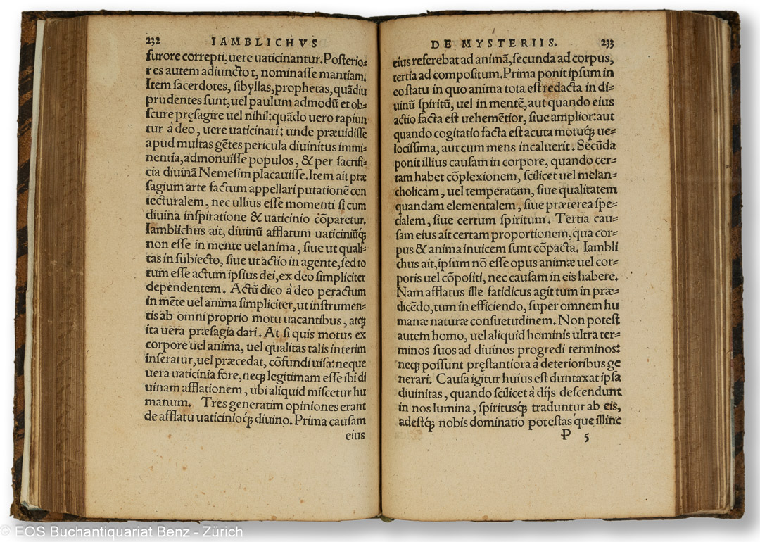 Hermes Trismegistos: Mercurii Trismegisti Pymander, de potestate et sapientia dei. Eiusdem Asclepius, de uoluntate dei… lamblichus de anima & daemone. Idem de sacrificio & magia… Basileae, Isengrin, 1532. 8°. 480 (recte 460) S., (2) Bl. Mit 22 Holzschnittinitialen (davon 4 grössere, hübsch illustriert), am Schluss mit Druckermarke. Lederband des 17. Jahrh. mit Rücken- und Deckelvergoldung sowie mit dreiseitigem Goldschnitt (mit Blindprägung).