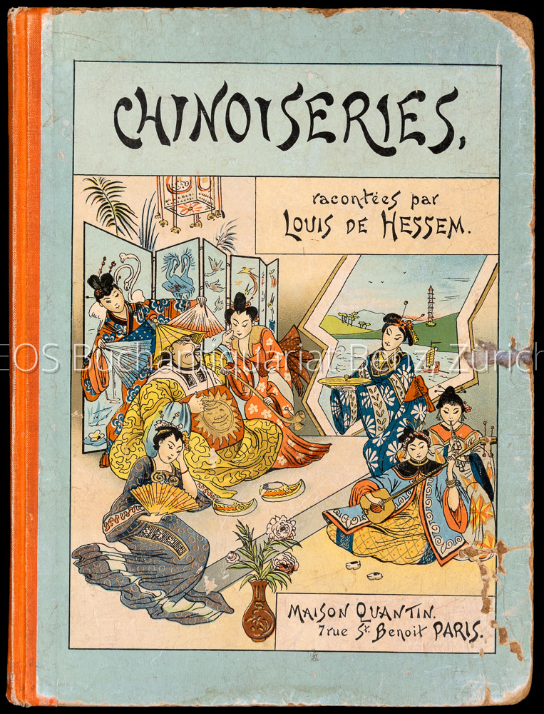 Hessem, Louis de: Chinoiseries. Racontées par Louis de Hessem. Paris, Maison Quantin, 1890. 4°. (16) Bl. Mit zahlr. farb. Illustrationen von Rudolf Alfred Jaumann. Mit farb. illustr. Halbleinenband.