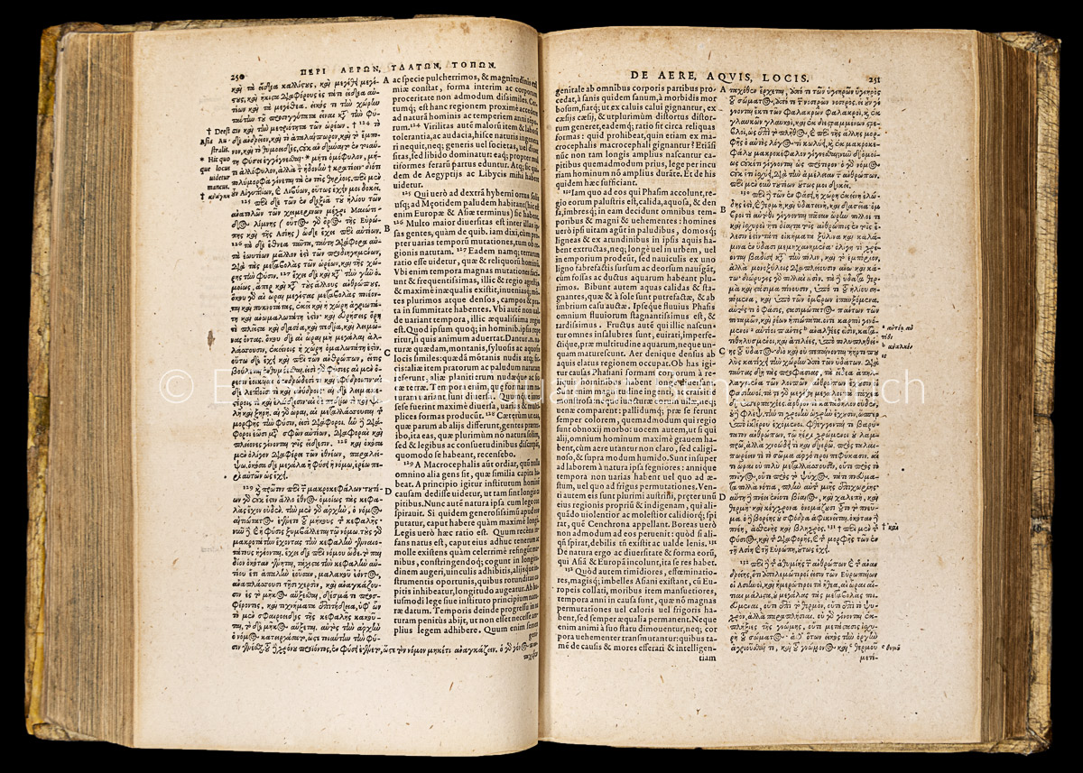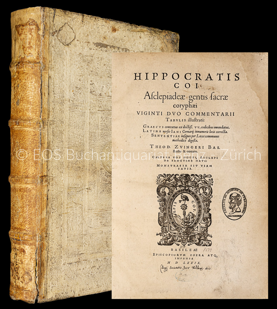 VD 16 H-3791. – Adams H-621. – Durling 4805. – Hirsch-H. V, 1056. – Choulant 36 «Sehr wertvolle Schrift». – Hieronymus: Griechischer Geist 325. – Erste Ausgabe der in tabellarischer Form herausgegebenen Kommentare durch Theodor Zwinger. Zwinger hatte bereits 1561 eine Galen-Ausgabe besorgt, nachdem er nach langjährigen Studien in Lyon und Paris 1559 in seine Heimatstadt Basel zurückgekehrt war. Bereits während seiner Zeit in Frankreich hatte Zwinger, wie er im Vorwort schreibt, Pläne zur Herausgabe eines Hippokrates-Kommentar geschmiedet. Offenbar konnte er sich dazu erst nach dem Tode von Conrad Gessner (1565) entschliessen. – Durchgehend leicht gebräunt und fleckig. Zu Beginn mit Wasserrand. Titel mehrfach gestempelt. Einbandrücken fachgerecht restauriert. (Sprache: Lateinisch / Latin)