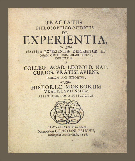 Historia morborum, qui annis MDCIC, MDCC. MDCCI Vratislaviae grassati sunt, a colleg. acad. Leopold(anum) nat. curios … in luce edita … – (Vorgebunden:) Tractatus philosophico-medicus de experientia … (Vorgebunden:) Observationes practicae de hydrope pectoris. In quibus de signis det causis occultioris hujus morbi, ac curandi ratione disseritur. Breslau und Leipzig, Christian Bauch, 1706. 2 Werke in einem Band. Kl.-4°. 8 n.n. Bl., 39 S., 1 S.; 8 S., 62 S., 1 Bl.; 5 n.n. Bl., 318 S. 5 n.n. S. Index. Papierumschlag der Zeit (ohne Einband).