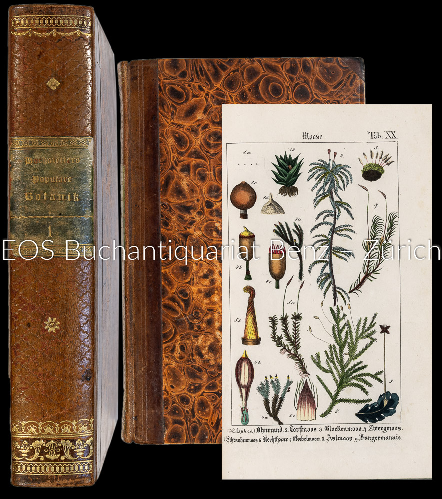 Hochstetter, Ch(ristian) F(erdinand Friedrich): Populäre Botanik, oder fassliche Anleitung zur Kenntniss der Gewächse … Zum Gebrauch und Selbstunterricht der Erwachsenen und der Jugend … Reutlingen, Johann Conrad Mäcken, 1831. 2 Bände. Gr.-8°. (2) Bl., XIV S., (1) Bl., 808 S.; (1) Bl., S. 809–910, (30) Bl. (Register). Mit lithogr. Porträt und 28 (davon 25 kolorierte) Tafeln. Halblederbände der Zeit mit Rückenschild und Rückenvergoldung.