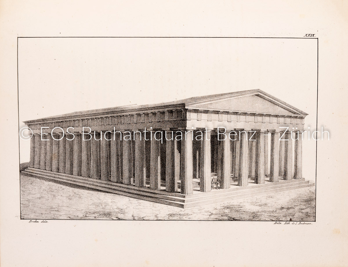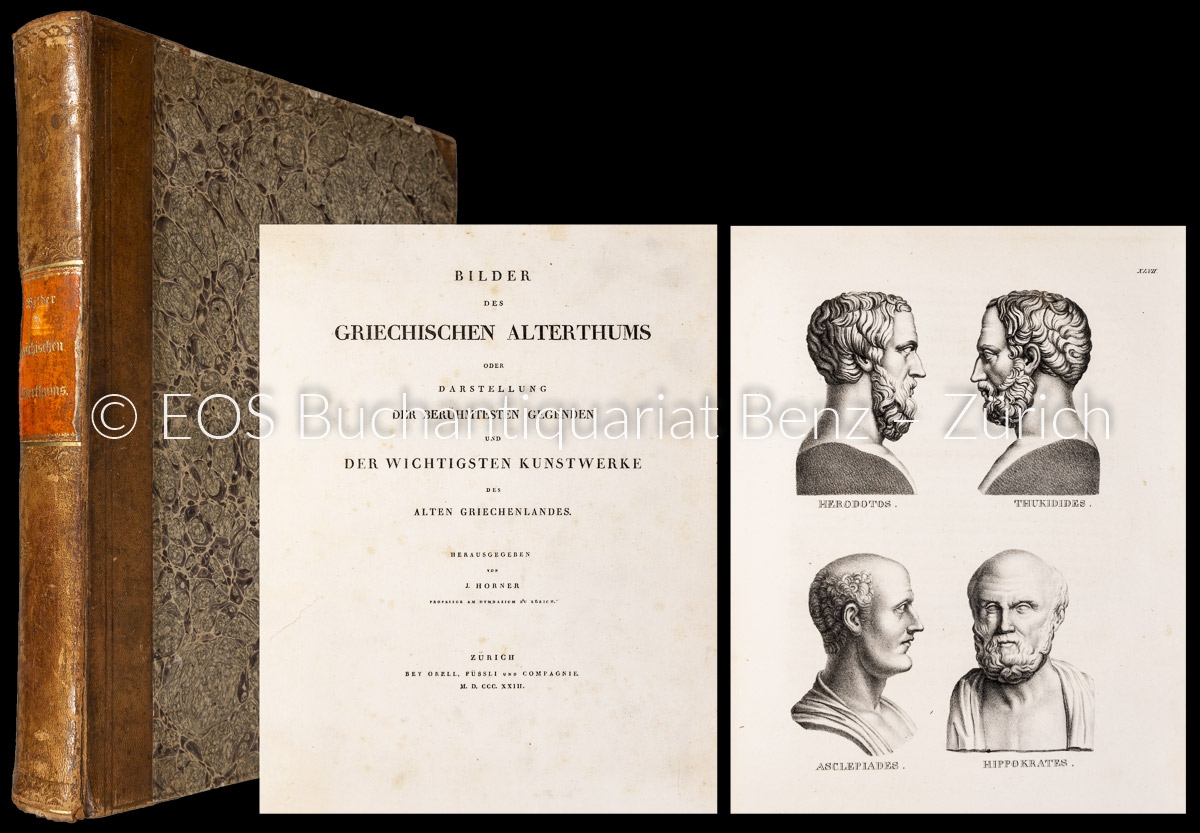 Horner, J(ohann) J(akob), Hrsg.:  Bilder des griechischen Alterthums oder Darstellung der berühmtesten Gegenden und der wichtigsten Kunstwerke des Alten Griechenlandes. Zürich, Orell, Füssli und Comp., 1823. Folio. IV, 178 S. Mit lith. Titel und 72 lith. Tafeln. Halbldr. d. Zt. mit rotem R’schild.