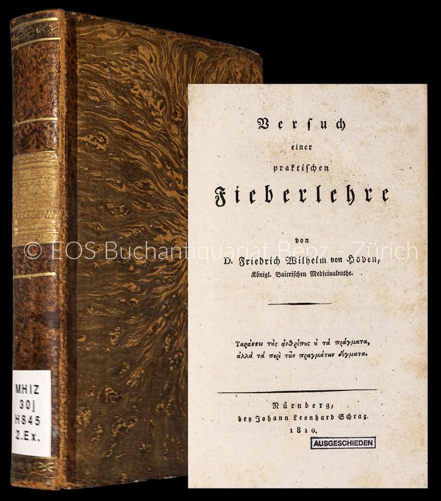 Hoven, Friedrich Wilhelm von: Versuch einer praktischen Fieberlehre. Nürnberg, Schrag, 1810. 8°. XVI, 446 S., (1) Bl. (Druckfehler). Pappband aus der Zeit.