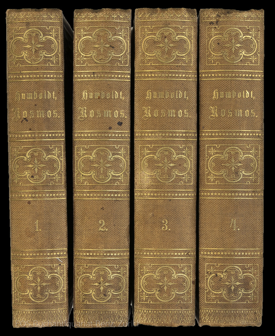 Löwenberg 199. – Errschien gleichzeitig in Tübingen und Stuttgart. Der Atlas in der Ausgabe von 1851. Die Textbänd in kleinoktav (Volksausgabe). Wichtiges, wenn nicht das wichtigste Werk von Alexander von Humboldt (1769-1859). Es erschien 1862 in Tübingen und Stuttgart noch ein fünfter Textband. Mit zeitgenössischer handschr. Widmung auf dem fliegenden Vorsatz. – Das Papier durchgehend gebräunt und stockfleckig. Die Einbände berieben. Die Rücken verblichen. (Sprache: Deutsch / German)