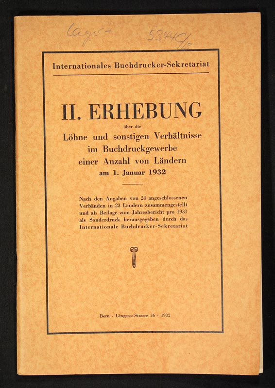 II. Erhebung über die Löhne und sonstigen Verhältnisse im Buchdruckgewerbe einer Anzahl von Ländern am 1. Januar 1932. Nach den Angaben von 24 angeschlossenen Verbänden in 23 Ländern zusammengestellt und als Beilage zum Jahresbericht pro 1931 als Sonderdruck herausgegeben durch das Internationale Buchdrucker-Sekretariat. Bern, Länggass-Str. 36, 1932. Gr.-8°. 56 S. Orig.-Broschur.