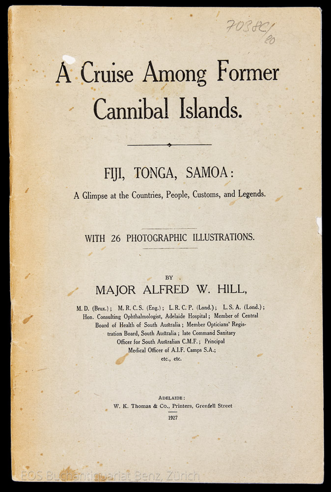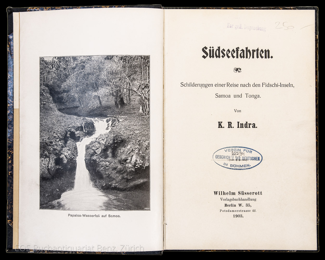 Indra, K(arl) R(udolf): Südseefahrten. Schilderungen einer Reise nach den Fidschi-Inseln, Samoa und Tonga. Berlin, Wilhelm Süsserott, 1903. 8°. 226 S. Mit 8 Tafeln nach Fotografien. Halbleinenband der Zeit.