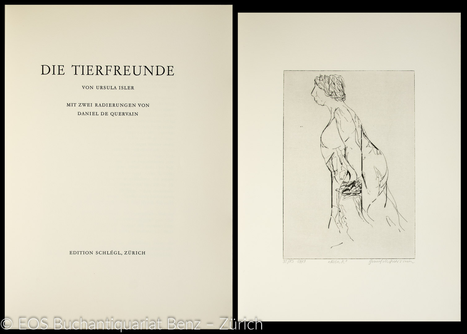 Isler, Ursula:  Die Tierfreunde. Zürich, Edition Schlégl, 1979. 2°. (8) Bl., (2) Bl. ganzseitige Radierungen von Daniel de Quervain. Beschriftete Original-Broschur