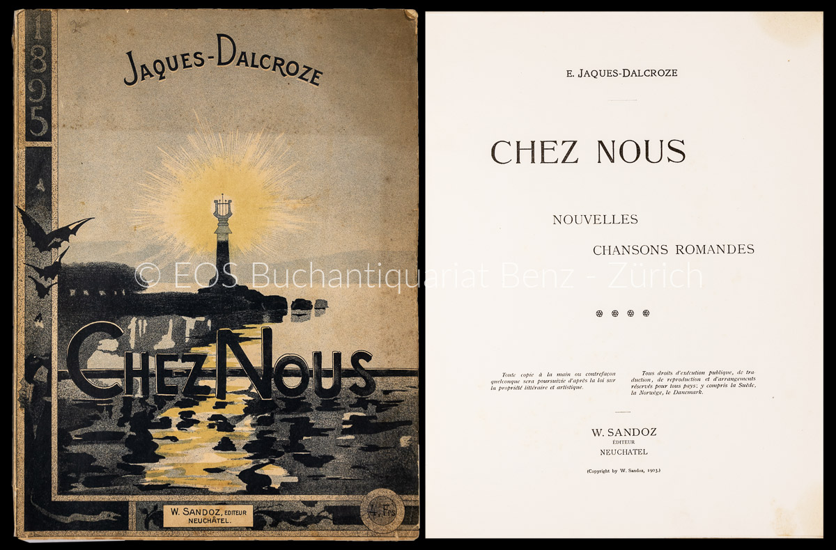 Jaques-Dalcroze, Emile: Chez nous. Nouvelles chansons romandes. Neuchâtel, W. Sandoz, 1903. 4° (31 x 23,5 cm). (4), 66 S. Farb. illustr. Orig.-Umschlag.