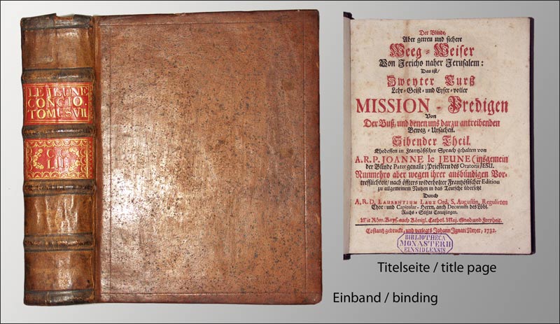 Jeune, Johannes le: Der Blinde, aber getreu und sichere Weeg-Weiser von Jericho naher Jerusalem. Das ist zweyter Curss lehr-geist- und eyfer-voller Mission-Predigen von der Buss, und denen uns darzu antreibenden Beweg-Ursachen. Sibender Theil … in das Teutsche übersetzt durch Laurentium Laux … Konstanz, Johann Ignaz Meyer, 1732. Teil 7. Gross-8°. (1) Bl., (24), 682, (21) S., (1) Bl. Lederbd. d. Zt. auf 4 Bünden mit je 2 goldgepr. Rückenschildern (berieben u. bestossen, Rücken am Kopf mit 0,5 x 1 cm Fehlstelle, Gelenke am Kopf über 2 cm angeplatzt).