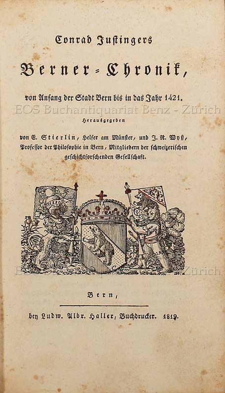 Barth 540; Feller/Bonjour 7-10; Wyss 109-113; Greyerz, Nation und Geschichte im bernischen Denken, S. 29-32. – Erste gedruckte Ausgabe der ersten vollständige Berner Chronik. „Die Justingersche Chronik stellt vereits den Typus der schweizerischen Städtechronik in Reinkultur dar“ (H. vonn Greyerz). – Einbandränder etwas berieben, zum Teil leichte Flecken, Wappen auf Titel etwas mit rötlicher Tinte nachgezogen. (Sprache: Deutsch / German)