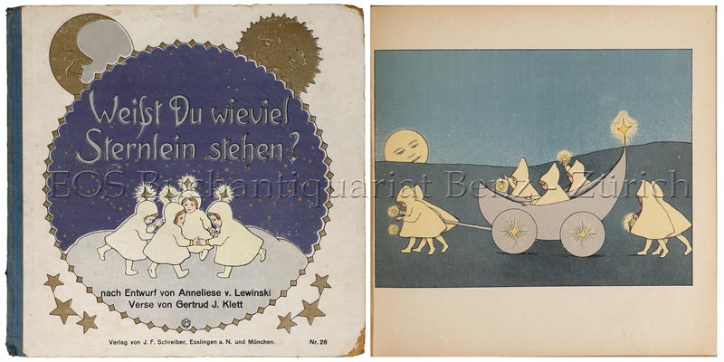 Klett, Gertrud J.: Weisst du wieviel Sternlein stehen?. Esslingen a.N. und München, Schreiber, (1925). 2. Auflage. 8°. 9 Bl. Mit 8 farb. ganzs. Illustr. nach Entwurf v. Anneliese v. Lewinski. Farb. illustr. Orig.-Halbleinenband.