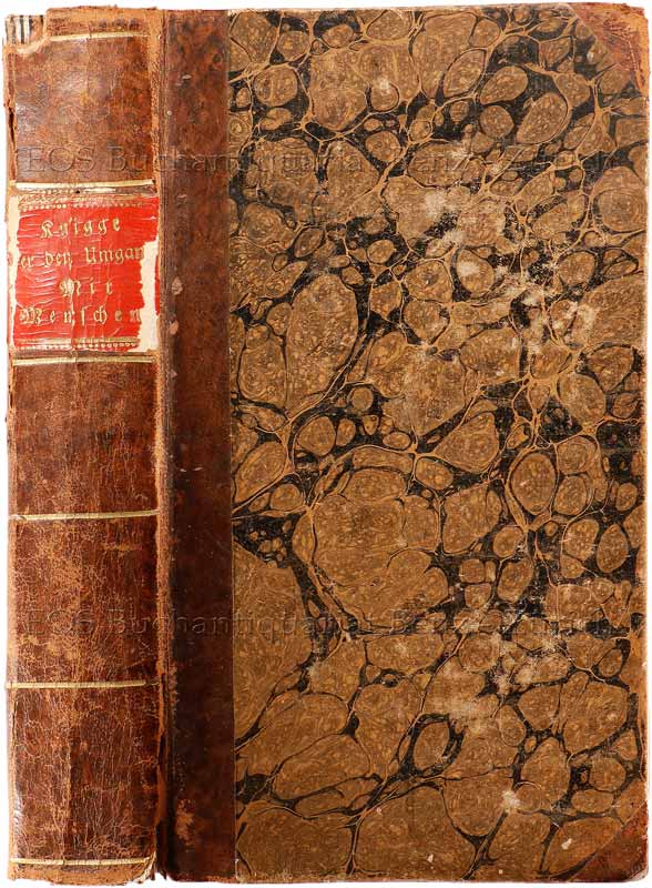 Knigge, Adolph Freyherr: Ueber den Umgang mit Menschen. Frankfurt und Leipzig, 1808. 3 Teile in 1 Band. 8°. (4) Bl., 156 S., (4) Bl., 184 S., (4) Bl., 159 S. Halblederband der Zeit mit marmoriertem Deckelbezug.