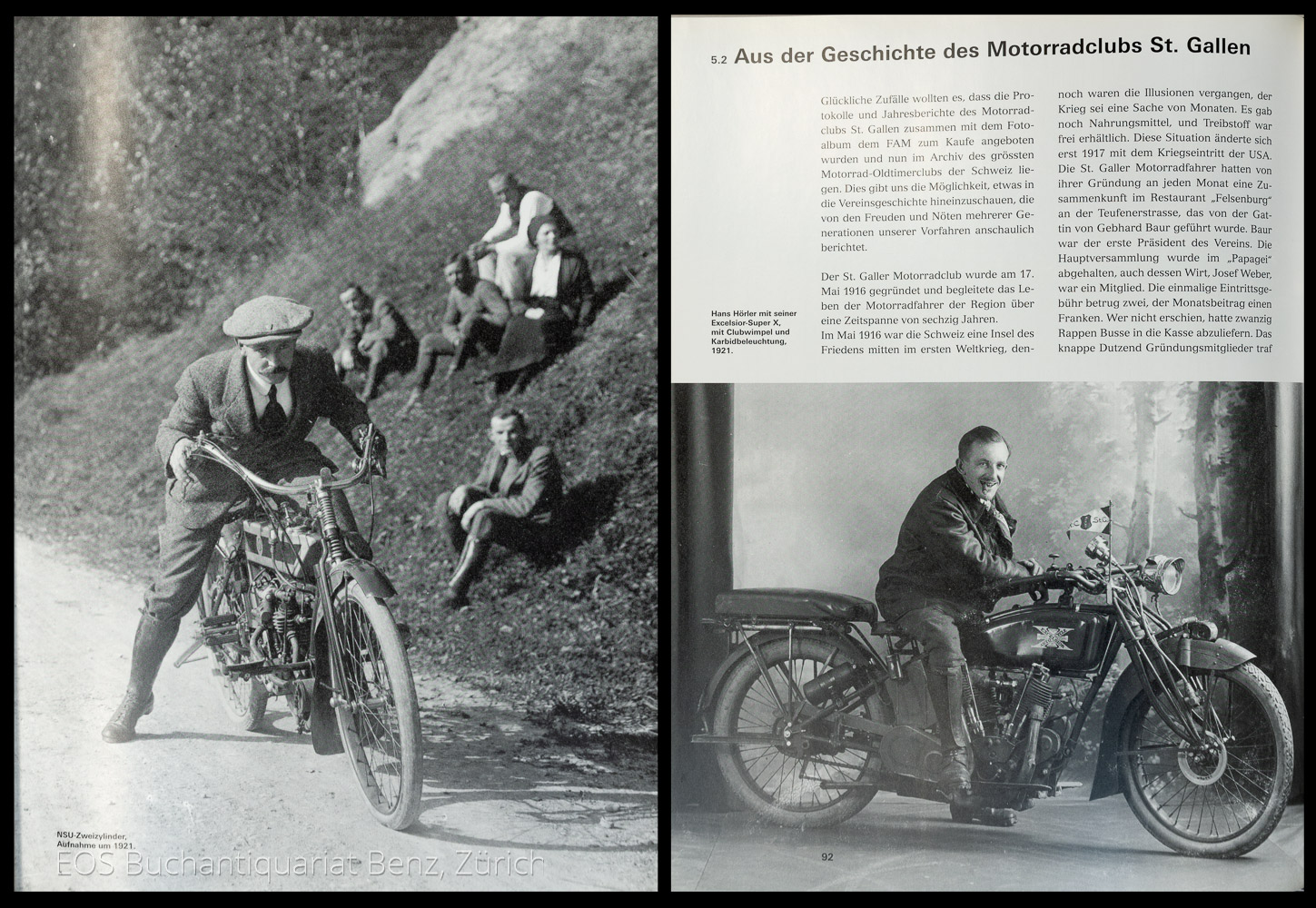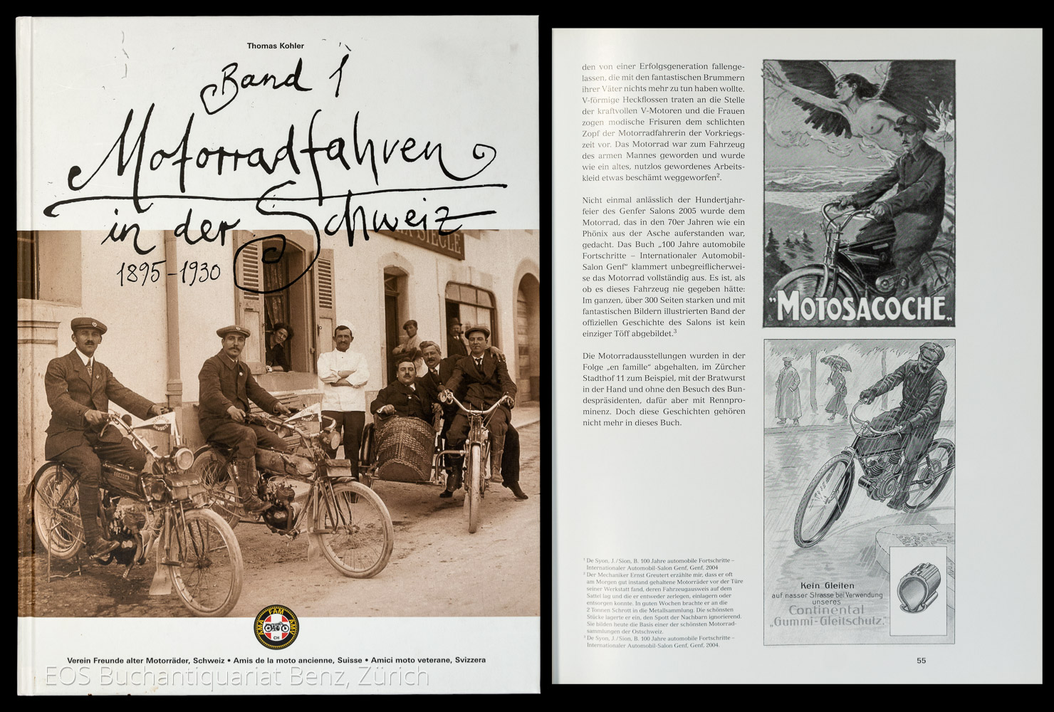Kohler, Thomas:  Motorradfahren in der Schweiz. 1895-1930. Schaffhausen, Meier Buchverlag, 2005. 198 S., Tabelle, und vielen schwarz-weiss Illustrationen. Illustrierter Leinenband.