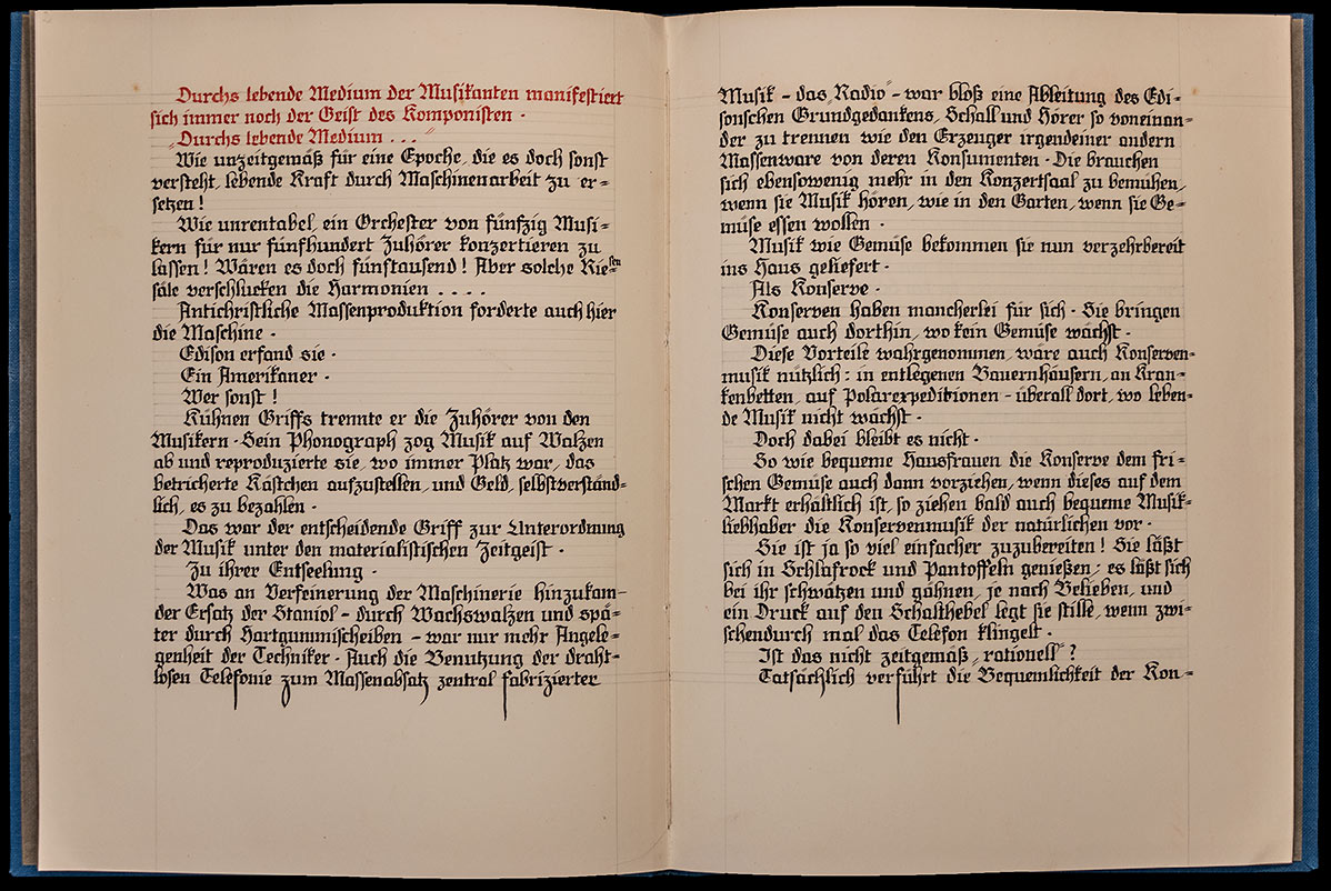 Konserven-Musik. Handschr. Abschrift aus dem Buche: Drei Gesichter Lucifers von Richard Katz. Baden, 1941. 4°. 4 S. Leinenband der Zeit.