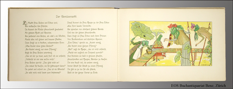 Vgl. Huggler WV 166. – Vgl. Rutschmann 46 f. – Sogenannte kleine Ausgabe (Auflage nach Huggler nicht genau bestimmbar) des ersten Bilderbuches des Schweizer Malers Ernst Kreidolf (1863-1956) mit personifizierten Pflanzen und Tieren. Da er keinen Verleger (für die erste Ausgabe) fand, lithographierte Kreidolf ein Jahr lang die rund 150 Platten, die er für den Farbdruck der Aquarelle benötigte, selber. Seine Hinwendung zur Natur und die Vermenschlichung der Pflanzen, wie sie für den Jugendstil typisch ist, machten das Buch erfolgreich. – In gutem Zustand.