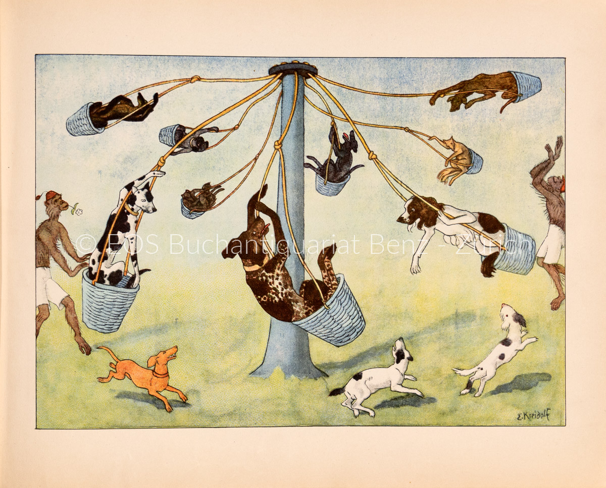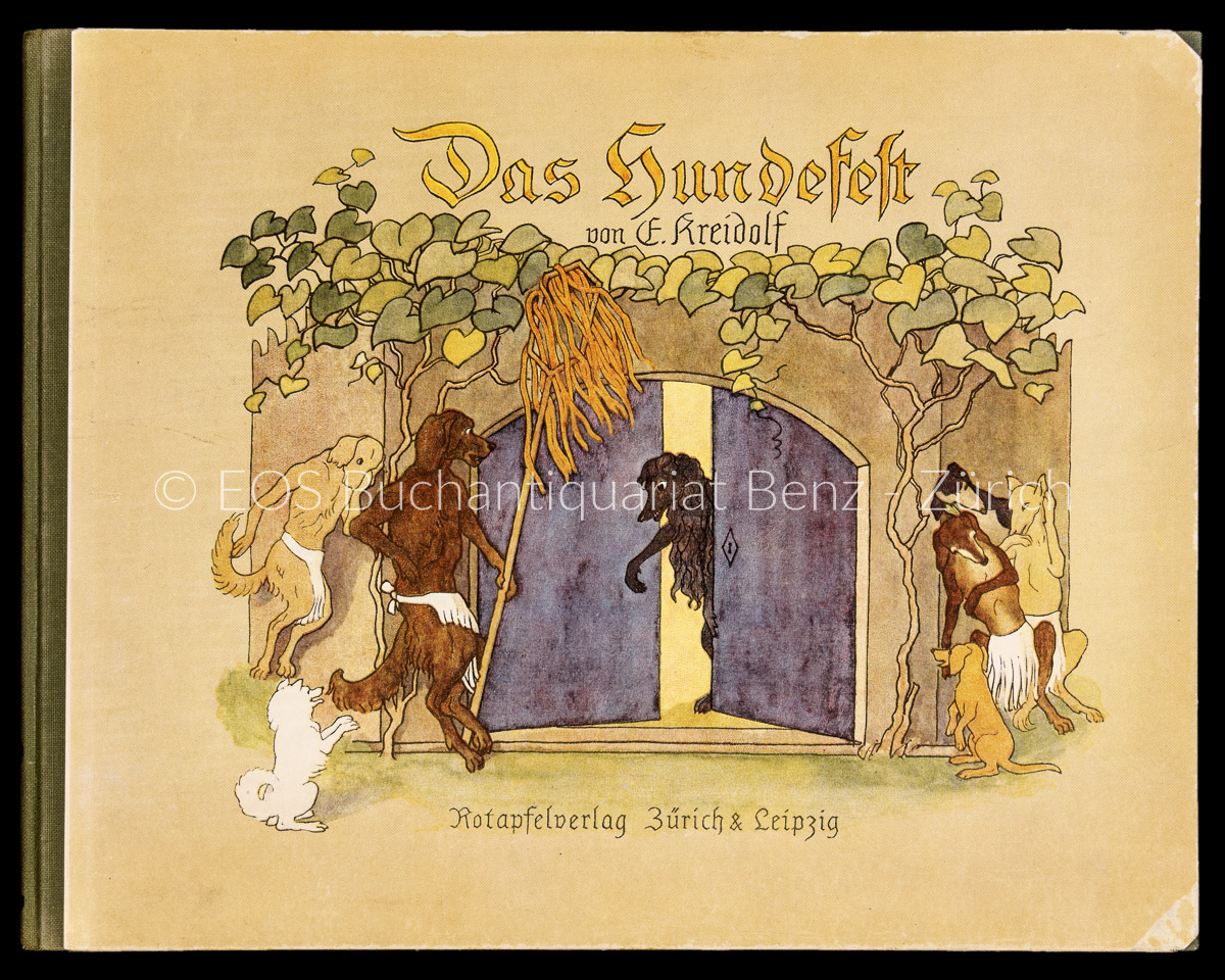 Kreidolf, Ernst:  Das Hundefest. Erlenbach-Zürich und Leipzig, Rotapfel, 1928. Quer-4°. (26) S. Mit 1 farb. illustr. Titel und 12 farb. Illustr. von Ernst Kreidolf. Illustrierter Halbleinenband.