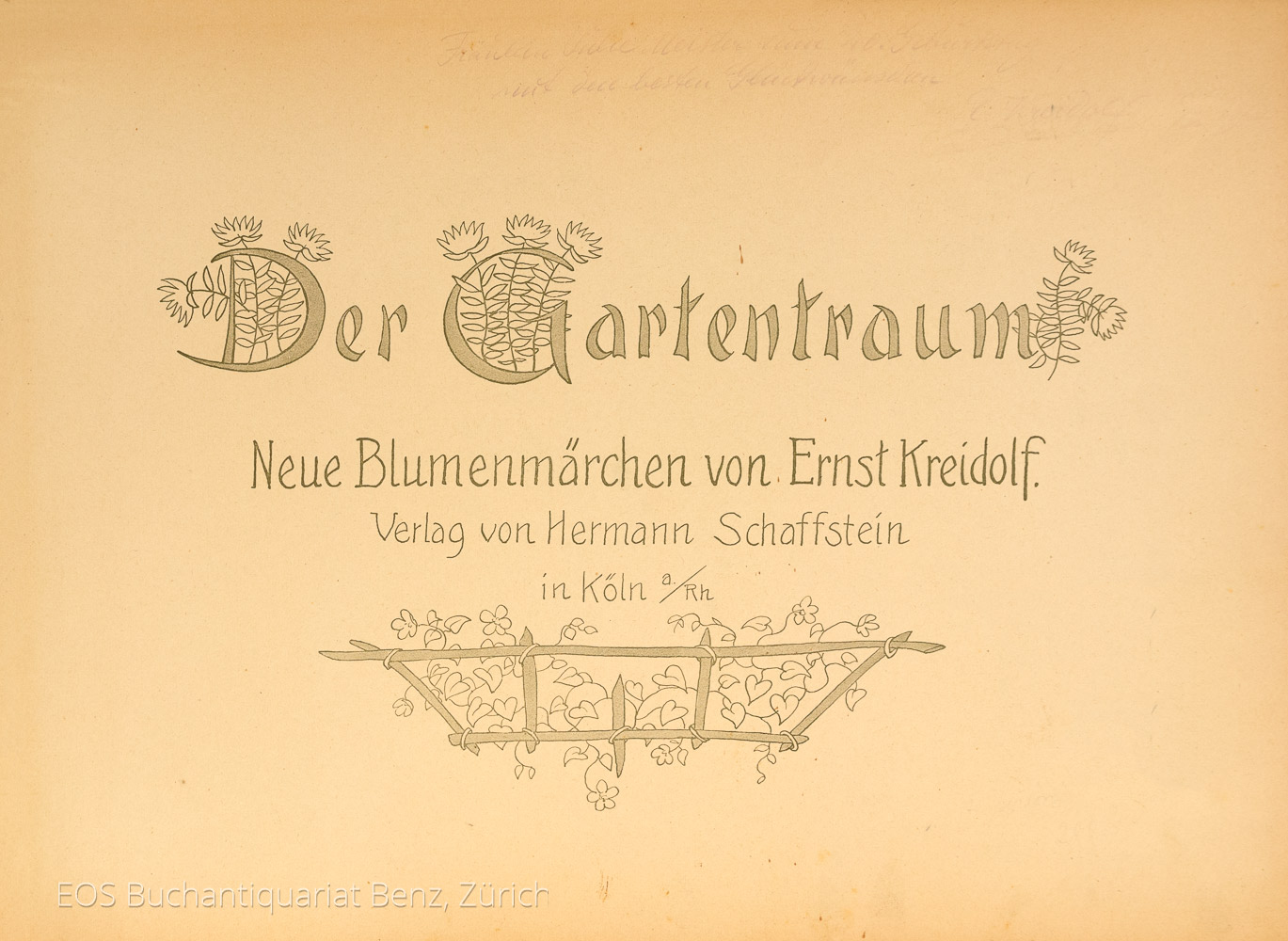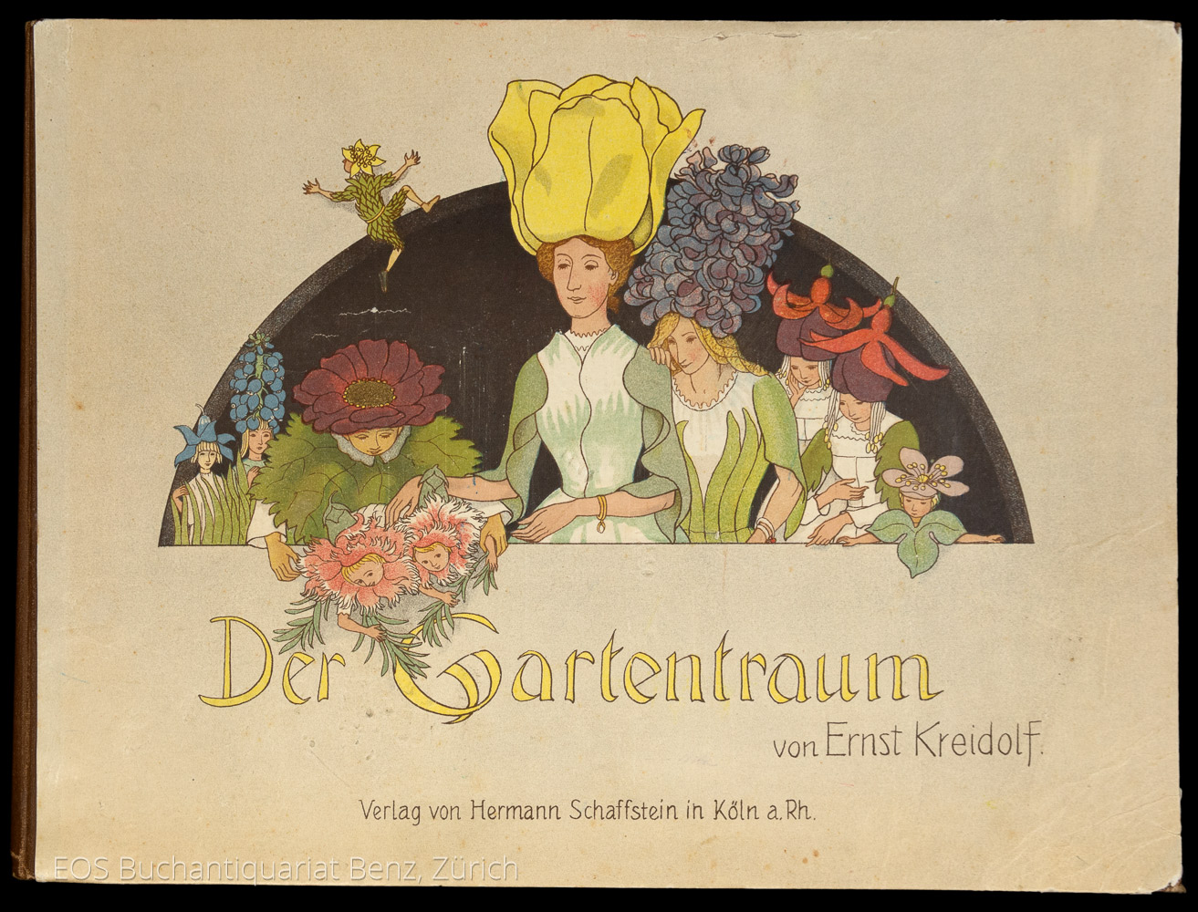 Kreidolf, Ernst: Der Gartentraum. Neue Blumenmärchen. Köln, Hermann Schaffstein, (1911). Quer-4°. 25 Bl. Mit 16 chromolithogr. Tafeln von Ernst Kreidolf. Chromolithogr. Orig.-Halbleinenband