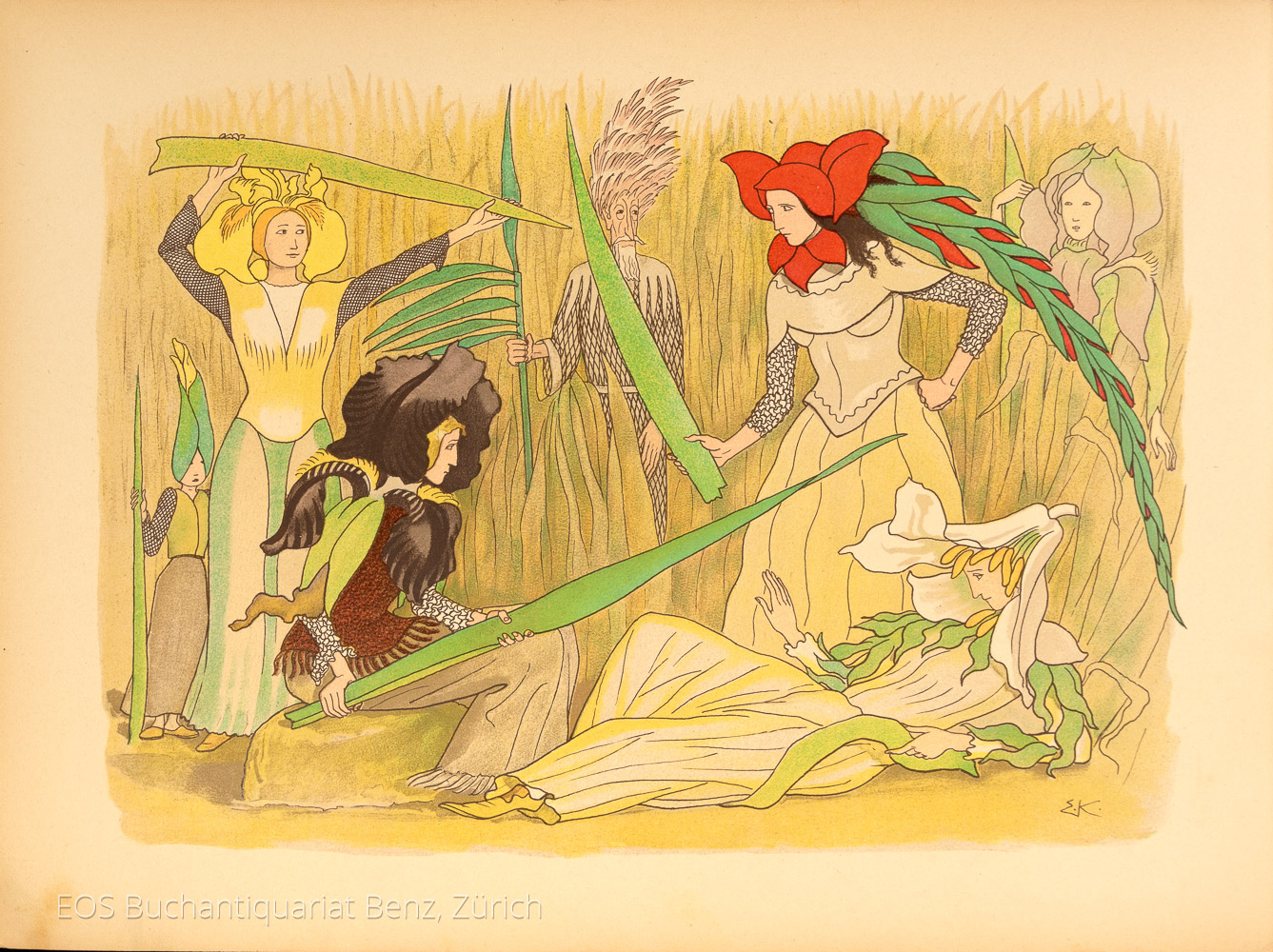 Huggler 182. – Rutschmann 46 f. – Stuck-Villa 399. – Cotsen 5938. – Erste Ausgabe mit Text u. Illustr. von Ernst Kreidolf (1863-1956). Die Bilder zeigen personifizierte Blumen u. Insekten in seiner eigentümlichen Art, die dem Geschmack des Jugendstils entgegenkam u. seine Bücher, bis heute, sehr erfolgreich machte. – Einband berieben und bestossen. Gebrauchsspuren. Im Buchblock lose. (Sprache: Deutsch / German)
