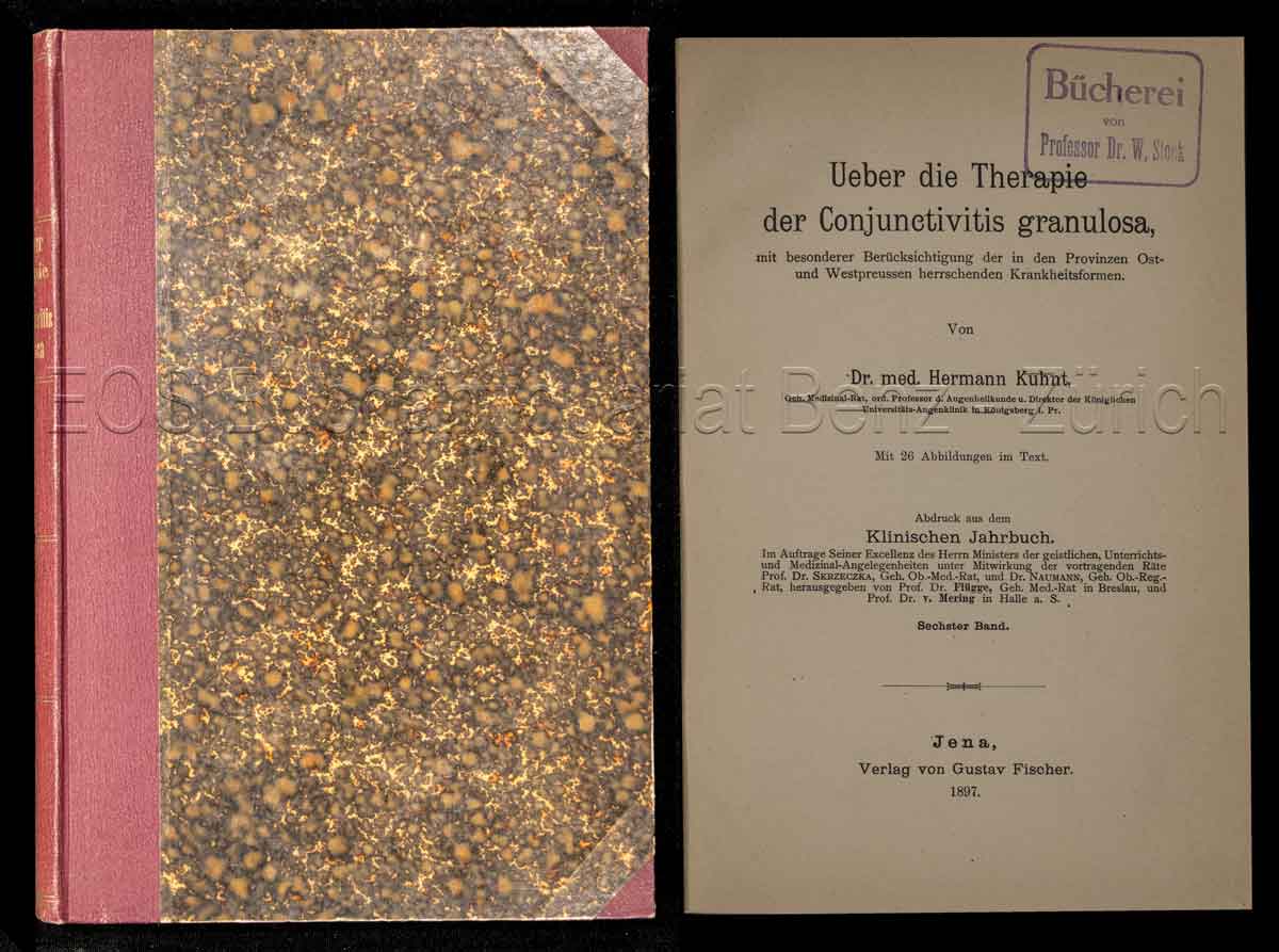 Kuhnt, Hermann:  Ueber die Therapie der Conjunctivits granulosa, mit besonderer Berücksichtigung der in den Provinzen Ost- und Westpreussen herrschenden Krankeitsformen. Jena, Fischer, 1897. 8°. Title, 172 p. With 26 textillus. Contemp. half cloth. „Abdruck aus dem Klinischen Jahrbuch“, vol. VI.
