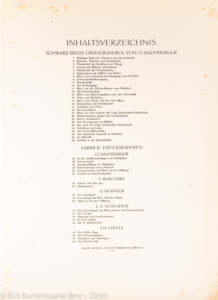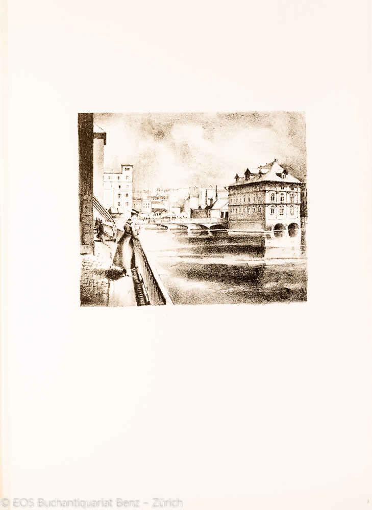 Nr. 214 von 500 Exemplaren für Herrn Dr. Robert Faesi in Anerkennung seiner Verdienste um die Organisation des Internationalen Mathematiker-Kongresses in Zürich 1932. – Lithographien von Otto Baumberger (1889-1961), Fritz Boscovits (1871-1965), A. Hoppler (1890-1919), Ernst Emil Schlatter (1883-1954) und Eduard Stiefel (1875-1967). – Mappe mit Gebrauchsspuren. (Sprache: Deutsch / German)