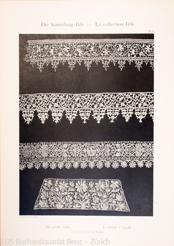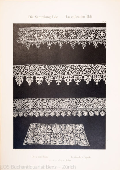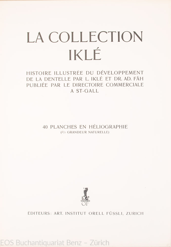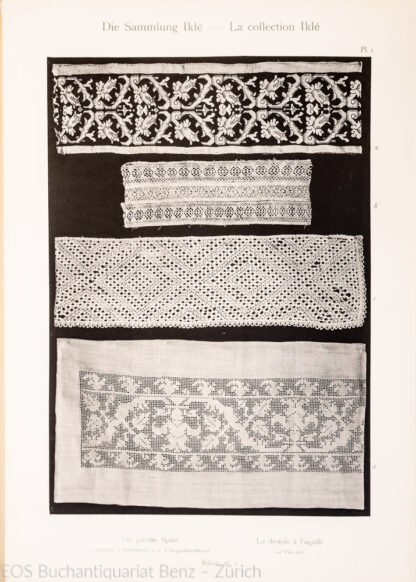 La collection Iklé – Dentelles. Histoire illustrée du développement de la dentelle par L. Iklé et Dr. Ad. Fäh. Zürich. au 1920. Gross-4°, Folio. 44 p., 40 planches en héliographie (2/3 grandeur naturelle). Broschur und Leinenmappe.