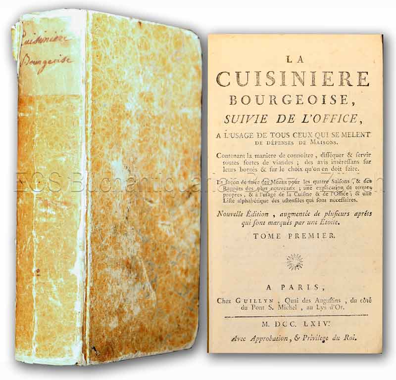 La cuisiniere bourgeoise, suivie de l’office, A l’usage de tous ceux qui se melent de déenses de maisons. Paris, Guillyn, 1764. 2 in 1 Band. 8°. XXII, (2), 270 S.; (1) leeres Bl., (2) Bl., 250 (252) S. Pappband der Zeit.